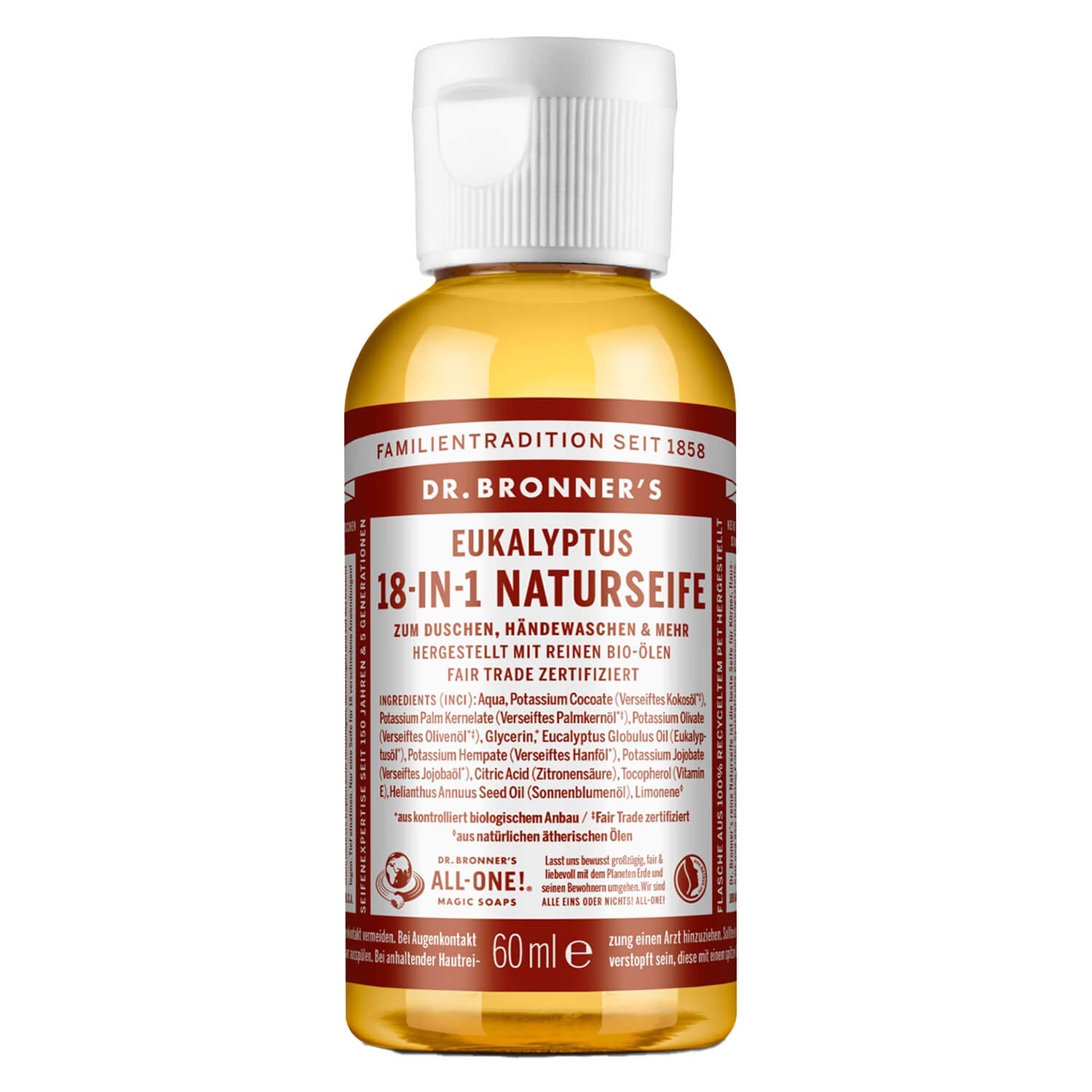 Comme une journée de spa dans sa propre salle de bains; ce savon transforme chaque pièce en une véritable oasis de bien-être grâce au parfum frais et typique de l'eucalyptus. Mais même indépendamment de la note agréablement épicée, l'huile essentielle bio fait tout un travail de bien-être, car elle ouvre les pores et purifie la tête ainsi que les sinus. La recette de base, composée d'huiles biologiques de coco, d'olive, de palmiste, de chanvre et de jojoba, fait le reste. Que ce soit le matin pour donner un coup de fouet ou après la journée de travail pour se détendre: ce savon a quelque chose à offrir à chaque type de bien-être. Bronner's est synonyme de cosmétique bio équitable et se base sur une chaîne de création de valeur durable. Tous les ingrédients sont issus de l'agriculture biologique contrôlée et certifiés équitables. Les produits sont biodégradables et peuvent être utilisés dans la nature. Bronner's renonce entièrement aux additifs tels que les agents moussants et les épaississants pour ses savons purement naturels. Ils sont fabriqués à partir d'huiles biologiques et affinés avec des huiles essentielles pures. Ils sont donc très économiques et polyvalents, et quelques gouttes suffisent pour obtenir une mousse veloutée.