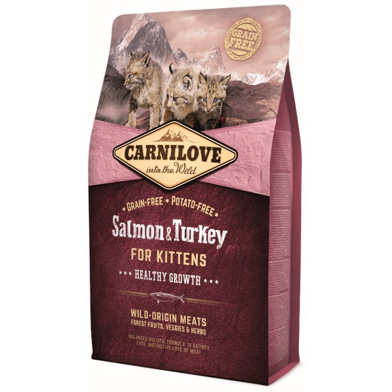 Carnilove saumon et dinde - formule sans céréales et sans pommes de terre pour les chatons et les enfants. Un complexe de nutriments composé de protéines, de graisses, de vitamines et dantioxydants naturels pour un développement sain du squelette et des muscles, ainsi que pour le développement du système immunitaire et de la capacité dapprentissage.
