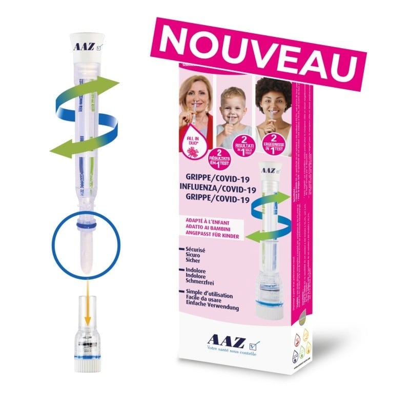ALL IN DUO est un test antigénique combiné permettant de détecter les virus COVID-19 et de la grippe à laide dun écouvillon nasal. Résultats rapides en 15 minutes. Convient aux adultes et aux enfants à partir de lâge dun mois. Laboratoire AAZ - Fabriqué en France.