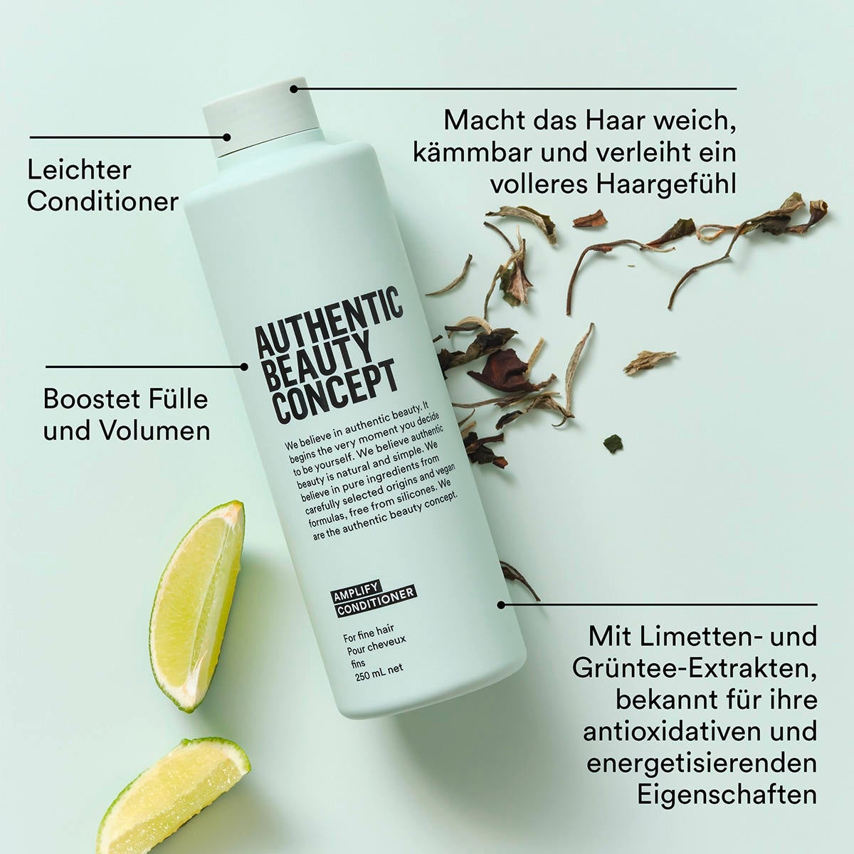 Avec un parfum d'agrumes, ce gel revitalisant non gras combiné au shampooing Amplify donne du corps et du volume. Mode d'emploi : Appliquer en longueur sur les cheveux lavés et humides. Laissez agir jusqu'à 2 minutes. Rincez abondamment. Formule végétalienne. PURE Sans parabens ni silicones. SANS FILTRE Un après-shampoing sans poids, avec une consistance de gelée transparente unique qui n'alourdit pas. AUTHENTIQUE Laisse les cheveux modelés et ajoute du volume pour une sensation de cheveux plus volumineux. ATTENTION Un épaississant soutient la consistance du gel transparent en apesanteur, tandis que l'agent conditionneur démêle les cheveux. Série de soins pour cheveux fins : Pas besoin d'être britannique pour aimer le thé ! Authentic Beauty Concept aime prendre une tasse de thé lorsque vous avez besoin d'une pause dans la journée. C'est pourquoi Authentic Beauty Concept est tombé sur le thé vert lors de la recherche d'ingrédients très efficaces pour leurs produits. Elle est connue pour ses fortes propriétés antioxydantes et a été le point de départ de la série Amplify. Les produits en apesanteur, combinés au coup de fraîcheur de la chaux, sont parfaits pour donner du volume aux cheveux.