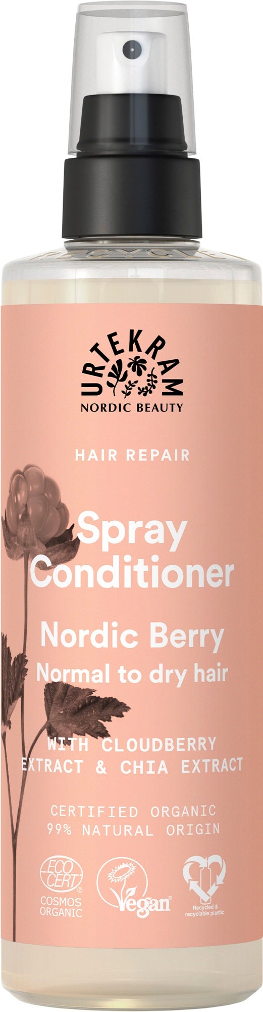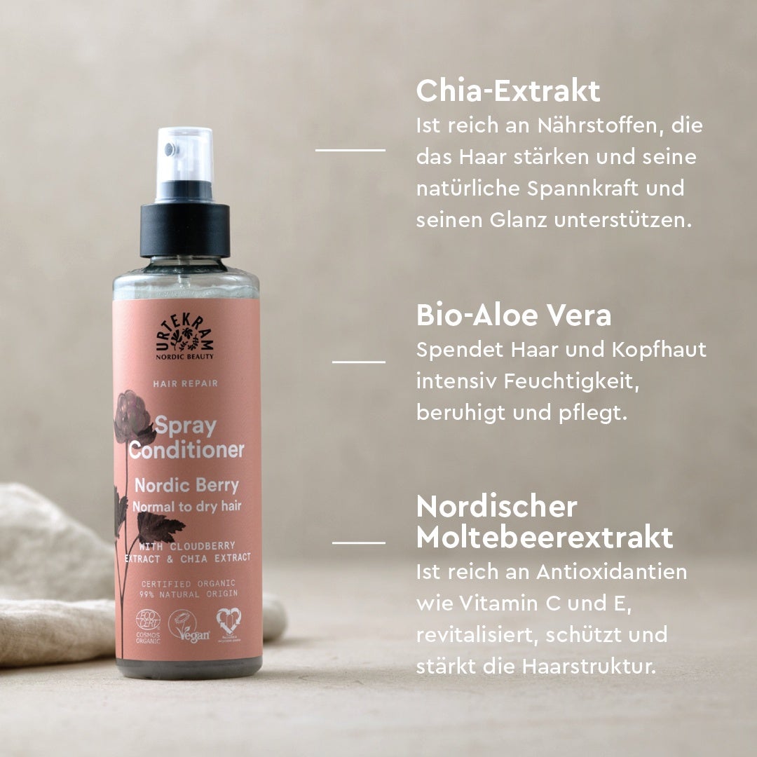 Le spray revitalisant Nordic Berry est un soin sans rinçage spécialement conçu pour nourrir intensément les cheveux abîmés et déshydratés. L'extrait de chia fortifiant et l'extrait de mûre des marais nordique riche en vitamines nourrissent et revitalisent la structure capillaire. L'aloe vera bio et la glycérine hydratent intensément, ce qui facilite le démêlage et confère aux cheveux une souplesse naturelle. Pour des cheveux forts et résistants, enveloppés d'un parfum fruité et frais de baies nordiques.
