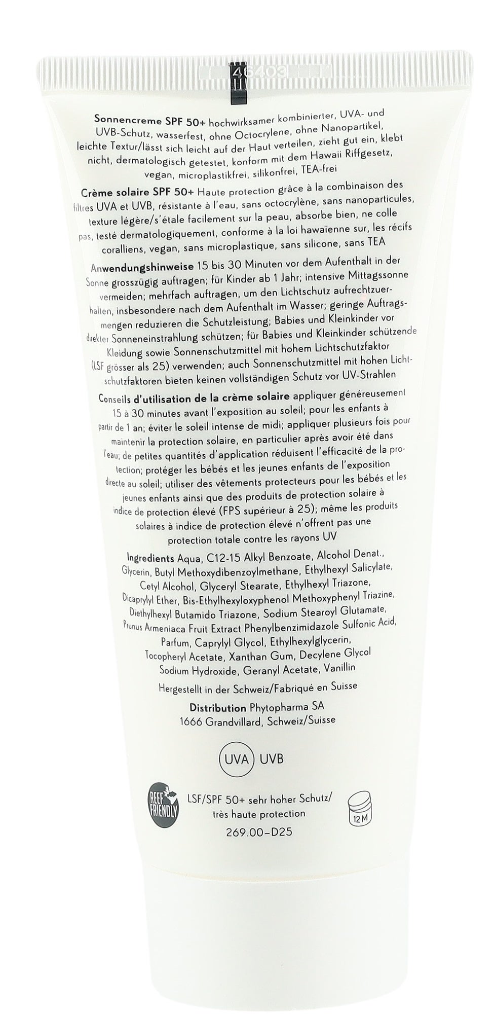 Crème solaire à l'extrait d’abricot SPF 50+ très haute protection.