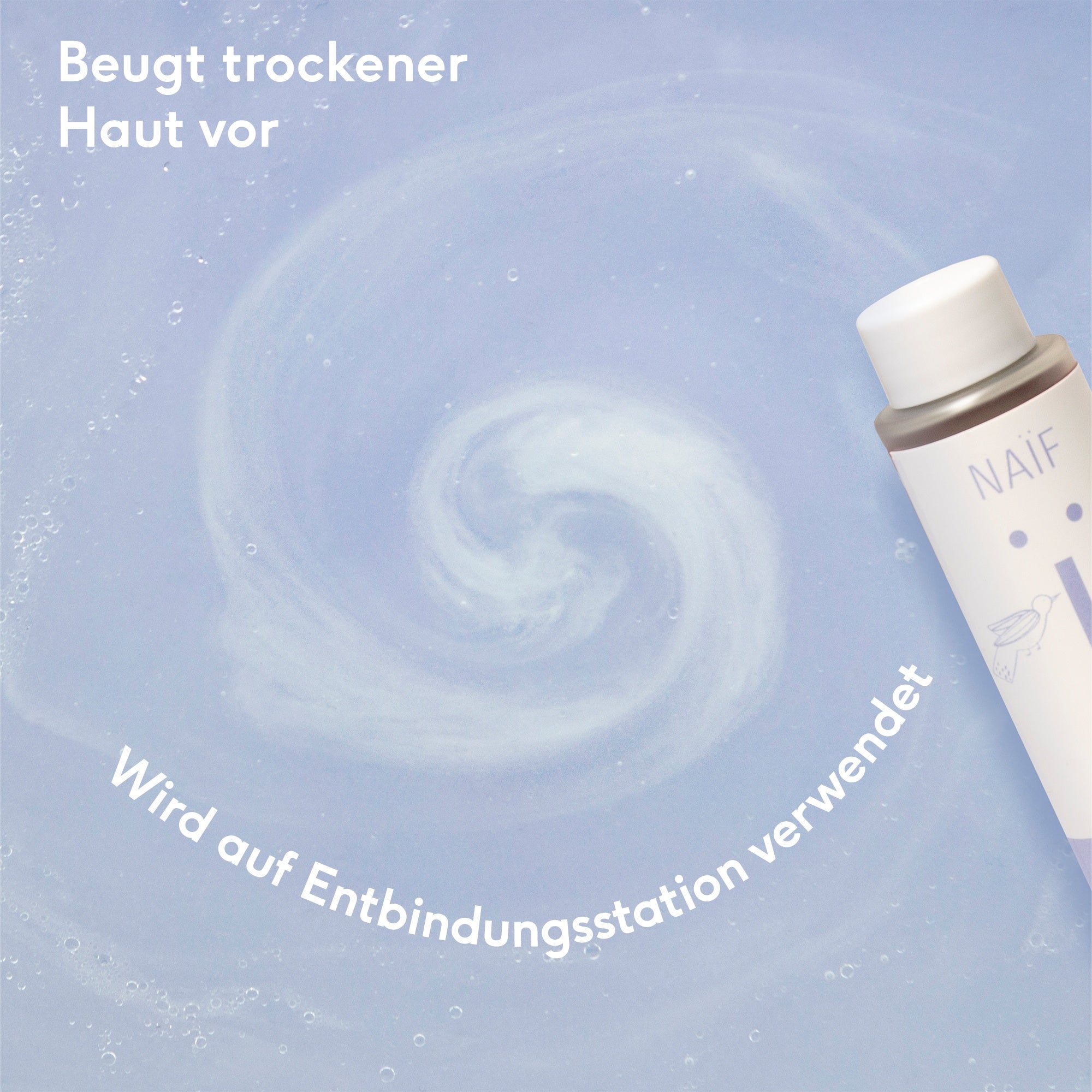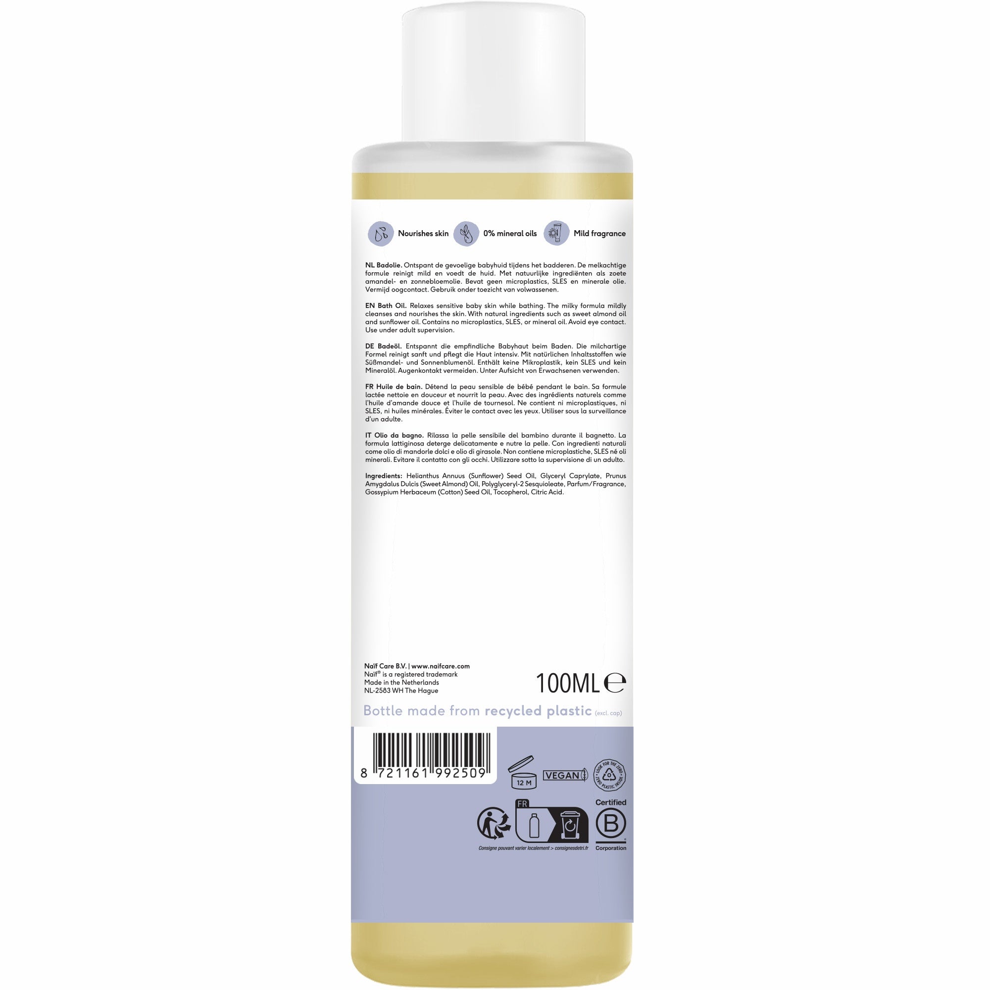 Le moment du bain est arrivé. Malheureusement, l'eau assèche la peau sensible de bébé. Il faut y remédier, c'est pourquoi nous avons développé l'Huile de bain traitante Naïf. Une huile de bain laiteuse qui hydrate la peau de bébé, se dissout bien et adoucit l'eau du bain. Et ce, sans glisser ! Elle est exempte de conservateurs chimiques et de substances nocives telles que PEG, SLS, SLES, phénoxyéthanol, parabènes ou huile minérale. En revanche, l'huile de bain pour bébé contient des ingrédients soignants comme la camomille et l'huile de graines de coton.