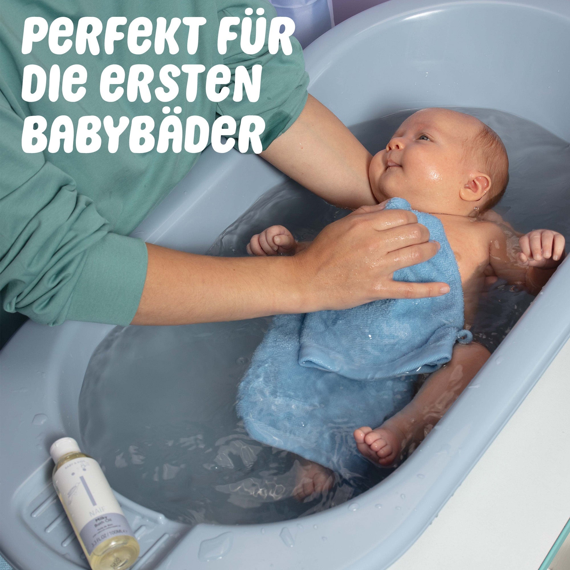 Remplir la baignoire de bébé et ajouter environ 10 ml d'huile de bain à l'eau du bain. Mélangez brièvement pour que l'huile se répartisse uniformément. Et plouf !