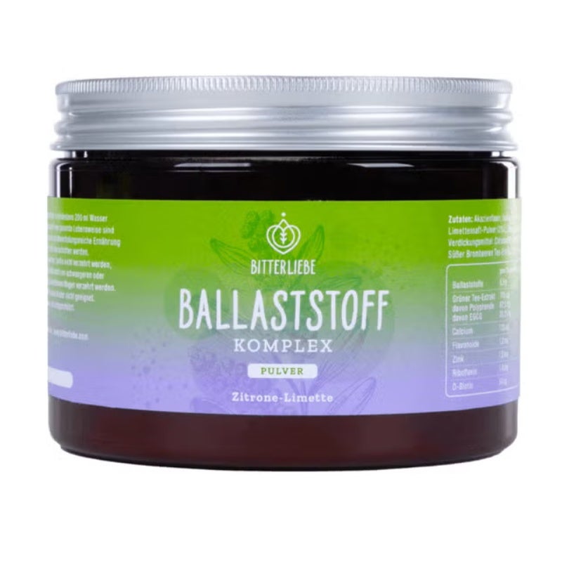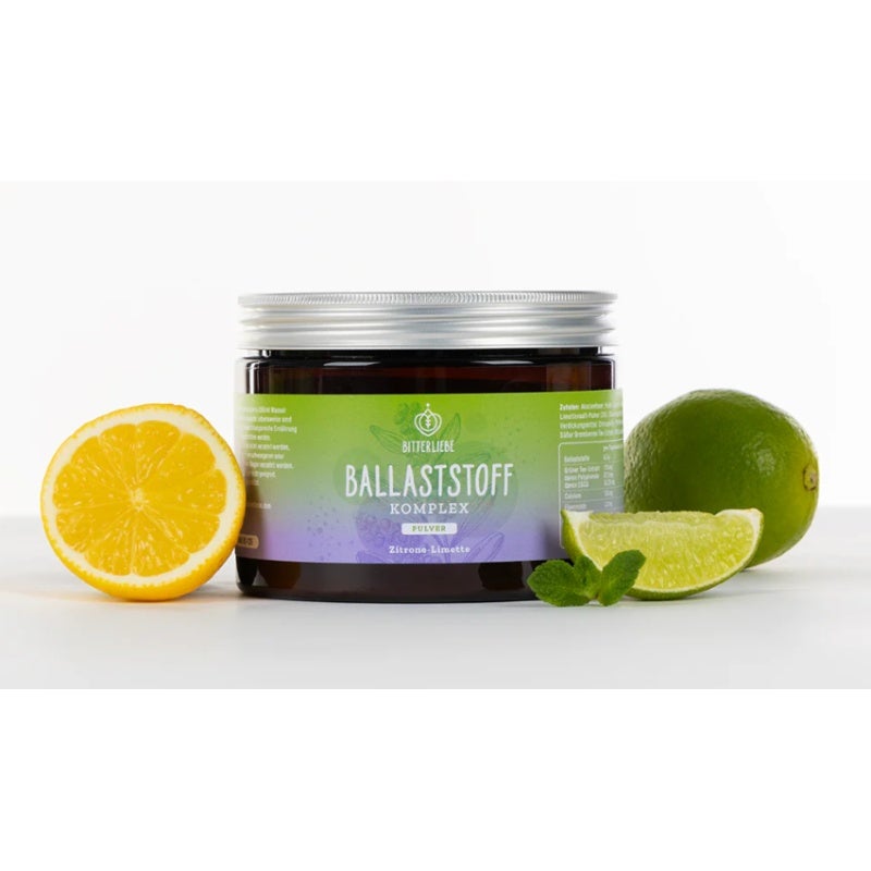 Akazienfaser, Inulin, Calcium, Zitronensaft-Pulver (Citrus Limon L.) (4,4%) , Flohsamenschalenpulver, Leinsamenmehl,Limettensaft-Pulver (2%) , Säuerungsmittel: Zitronensäure, Grüner Tee-Extrakt (Camellia sinensis) (1,7%), Verdickungsmittel: Citruspektin, Pfefferminz-Blattextrakt ( Mentha piperita ) (1%), Löwenzahn-Wurzelextrakt (0,6 ), Süßer Brombeeren Tee-Extrakt ( Rubus suavissimus) (0,4% ) , Zink, Riboflavin, D-Biotin