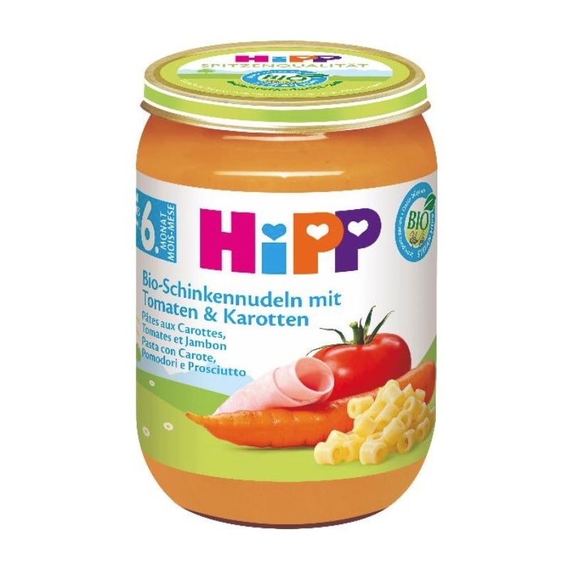 Hipp Nouilles au jambon bio avec tomates et carottes, un repas complet à partir de 6 mois.