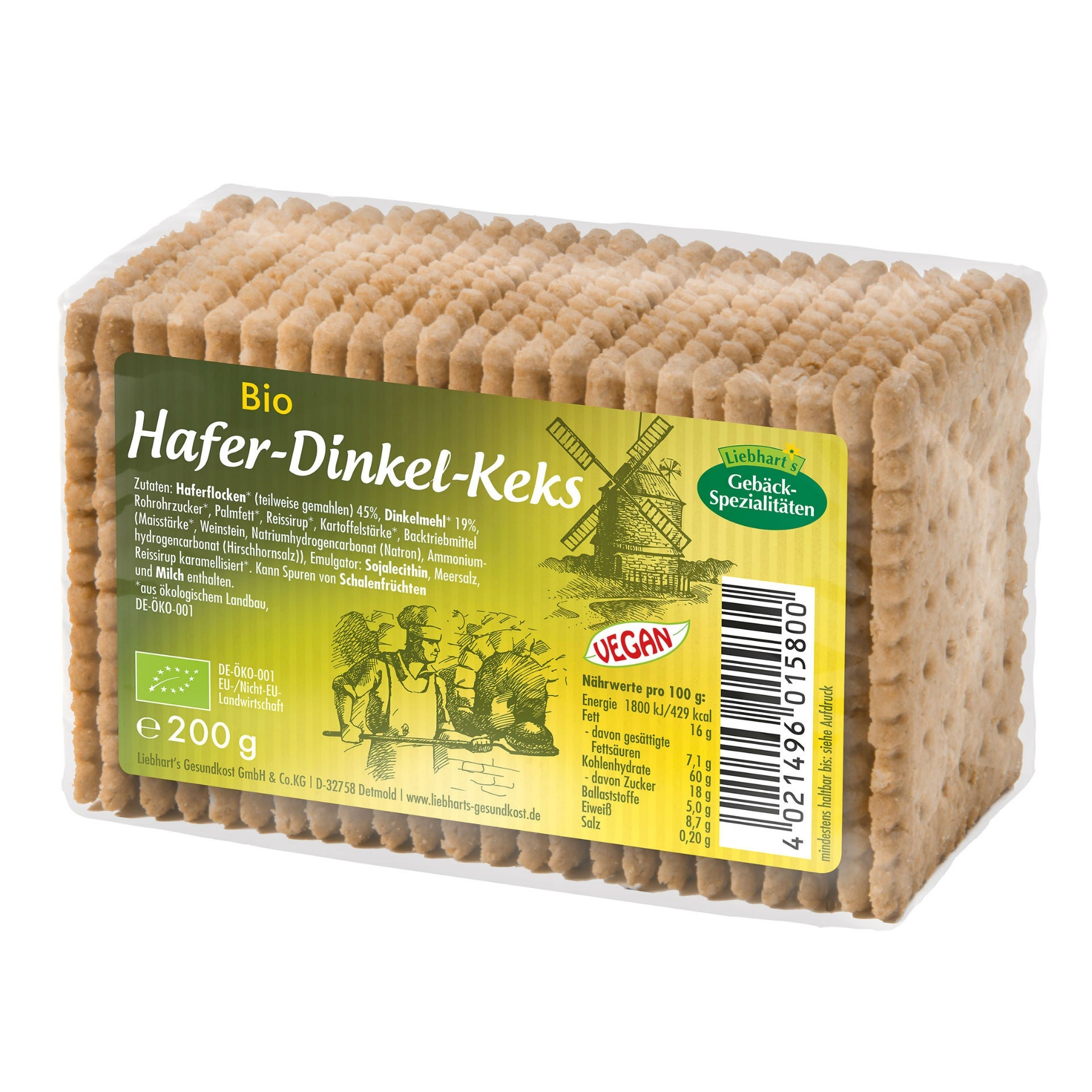 Flocons d'AVOINE* (partiellement moulus) 45%, farine d'ÉPEAUTRE* 19%, sucre de canne brut*, huile de palme*, sirop de riz*, fécule de pomme de terre*, poudre à lever (amidon de maïs*, CRÈME de tartre, bicarbonate de soude, bicarbonate d'ammonium (sel de c.