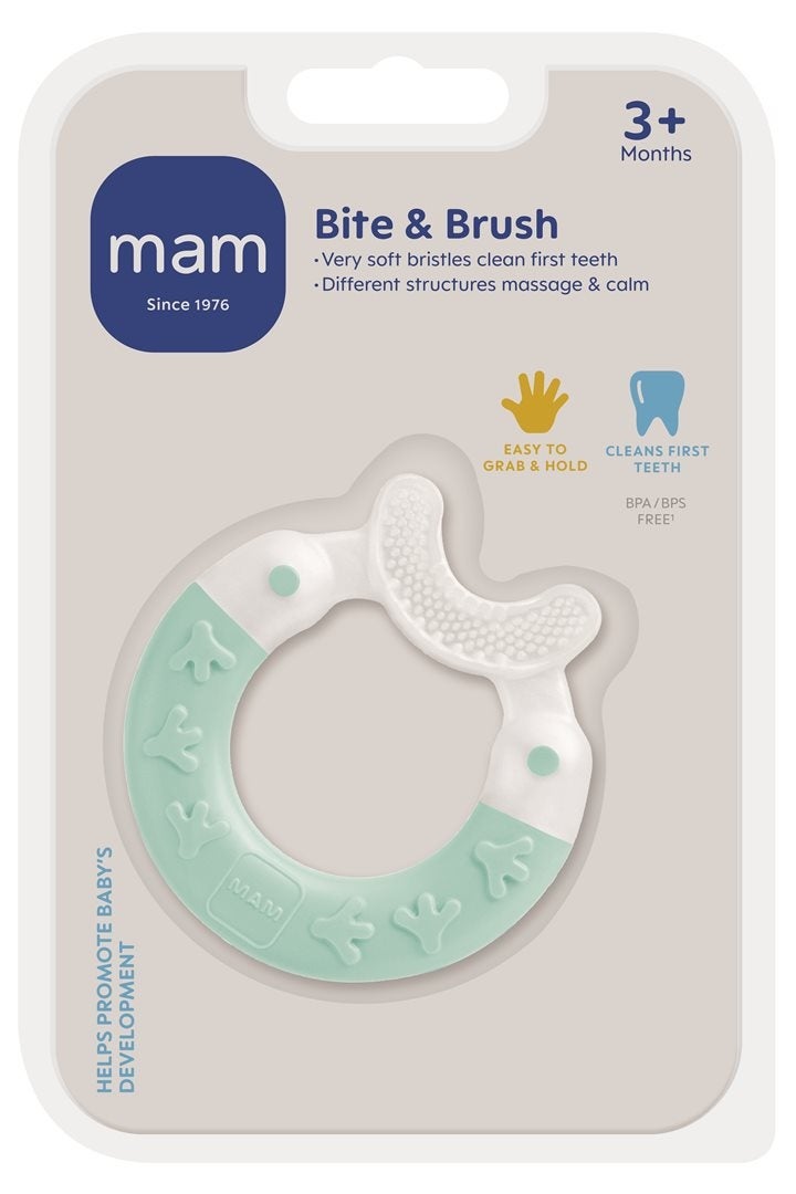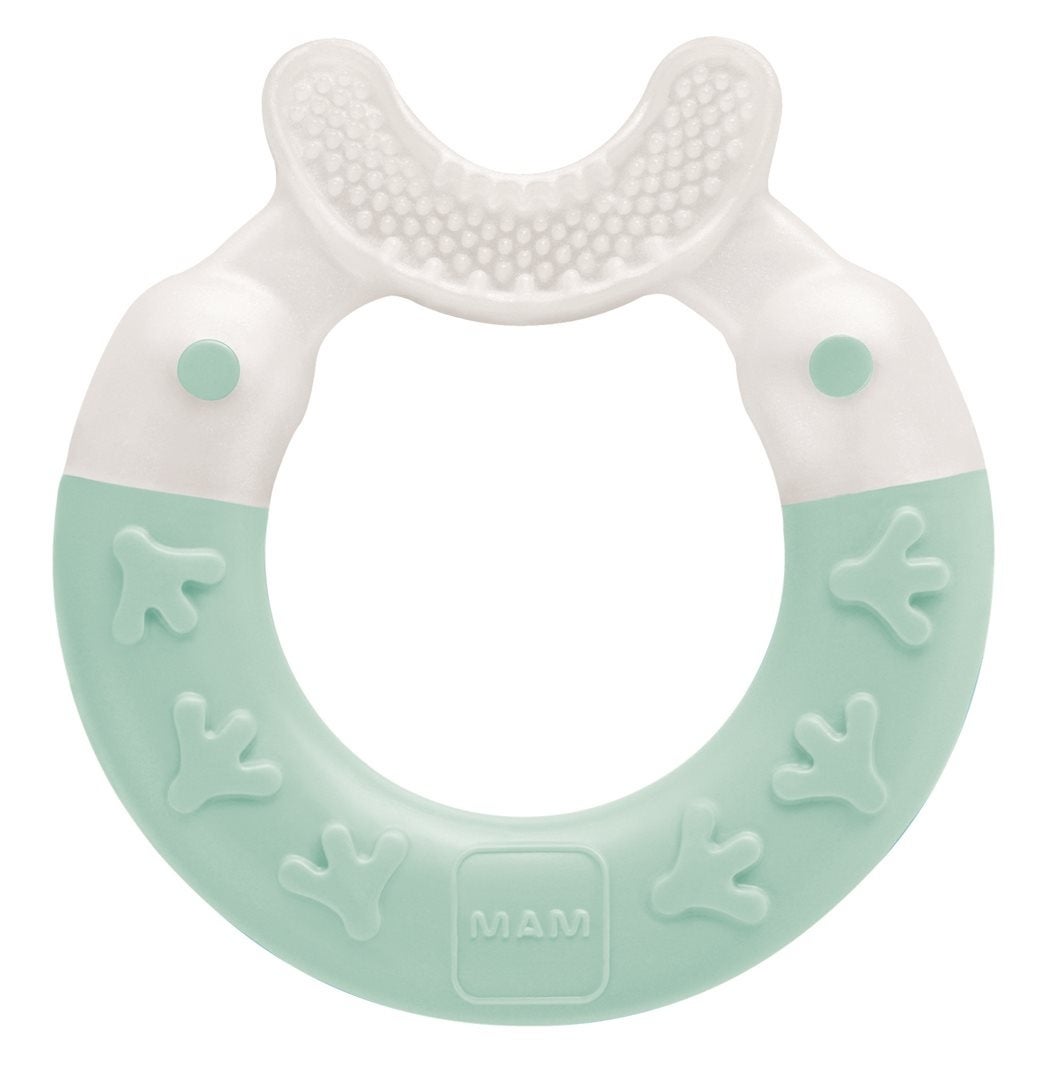 L'anneau de dentition Mordre & Brosser nettoie les permières dents du bébé et masse ses gencives sensibles.