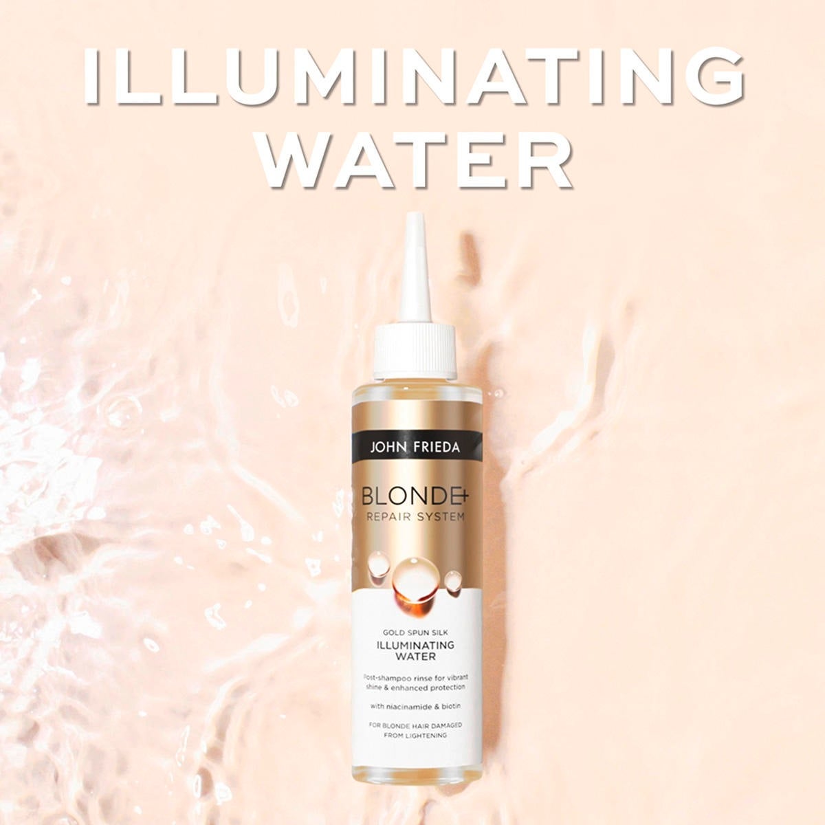 Blonde Gold Spun Silk Illuminating Water avec niacinamide & biontine confère aux cheveux blonds une brillance éclatante et dorée. Pénètre profondément dans les cheveux pour les rendre soyeux et les protéger contre les dommages et la porosité futurs.