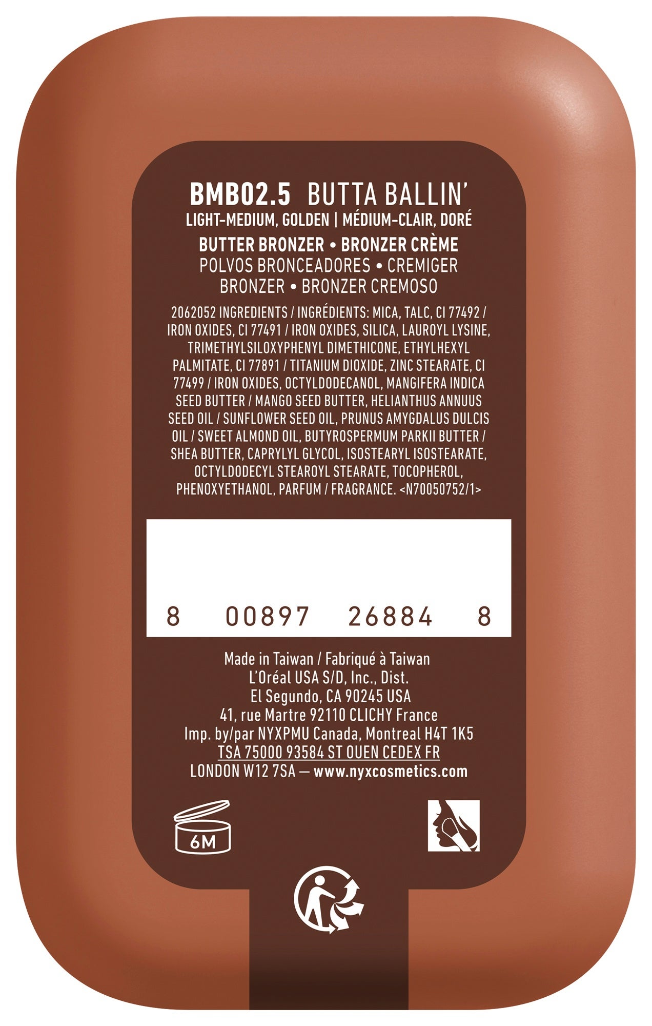 Le Buttermelt Bronze Bronzer de NYX Professional Makeup donne au visage un teint hâlé en un clin d'œil. Sa texture crémeuse s'estompe aussi facilement qu'une poudre, sans laisser de traces. Sa formule végane sans ingrédients d'origine animale est enrichie en beurre de karité, en beurre d'amande et en beurre de mangue, ce qui lui confère une texture onctueuse et nourrissante. Estompé avec un pinceau à bronzer, le Buttermelt Bronzer donne un éclat naturel qui dure toute la journée.