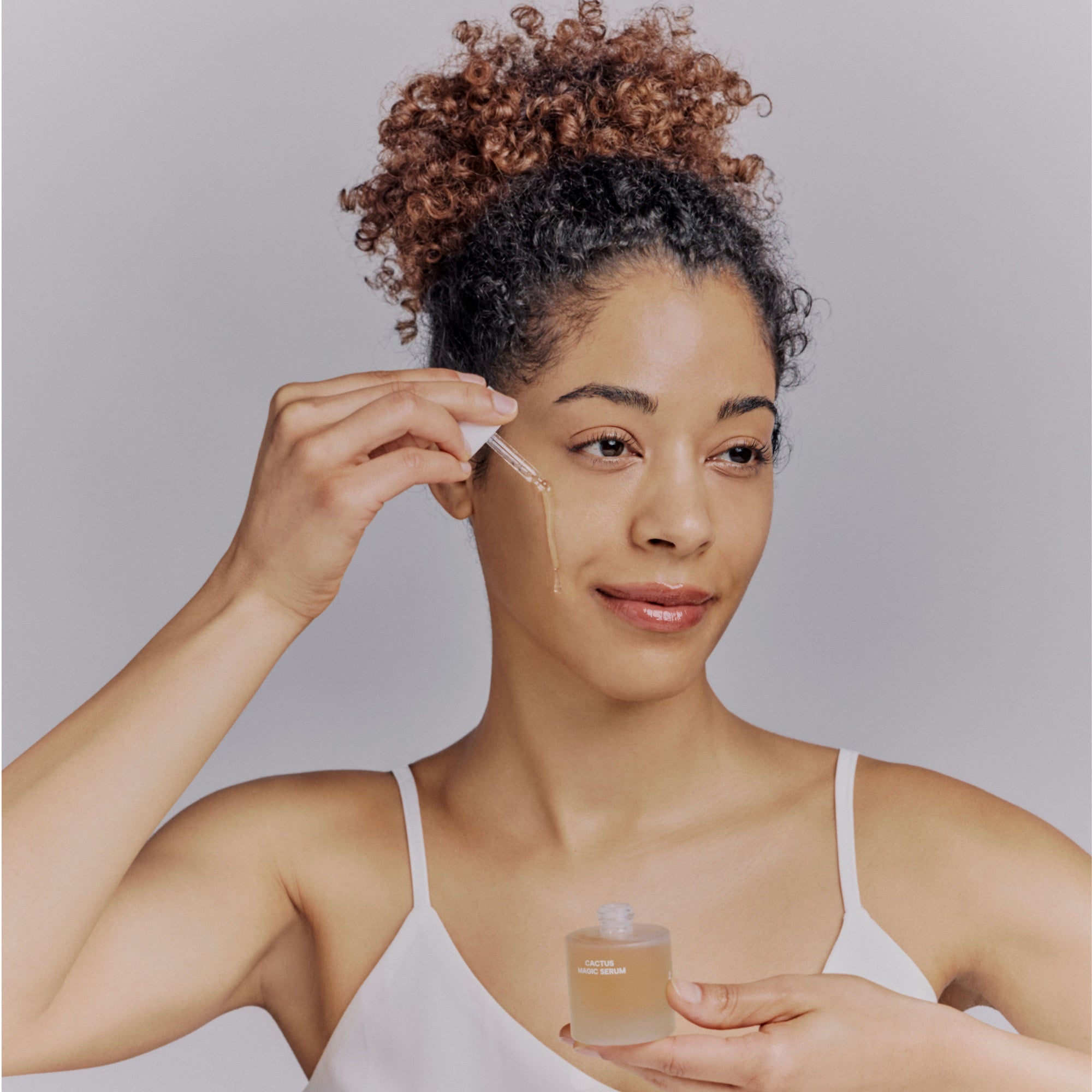 Cactus MAGIC SERUM de WHAMISA est un sérum régénérant pour une peau éclatante. Grâce au Cactus Cotton Lifting Complex™ et aux tiges de cactus biologiques, il améliore l'élasticité et la vitalité sans coller. Grâce à l'alpha-bisabolol pour éclaircir la peau et à l'adénosine pour stimuler la synthèse du collagène, ce sérum rajeunit et raffermit la peau et réduit les rides pour un teint plus jeune. Découvrez les effets du Cactus Cotton Lifting Complex™ pour une peau saine, élastique et éclatante.