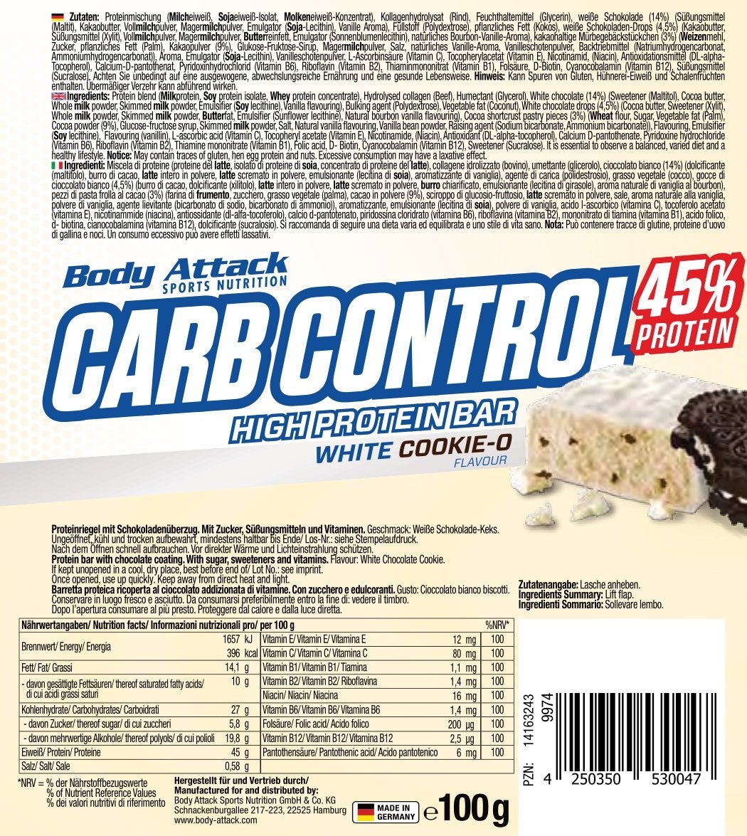 De zéro à la protéine en une seule bouchée. La barre protéinée Carb Control allie le meilleur goût à 45% de protéines de haute qualité - sans sucres ajoutés ni calories inutiles. Une couche croquante de véritable chocolat au lait, de nombreuses vitamines précieuses et le goût corsé de la garniture protéinée crémeuse font de Carb Control une barre protéinée de première classe. Toujours à portée de main. Toujours délicieuse. Toujours bonne. Il suffit de l'ouvrir, de mordre dedans - et ACTION!