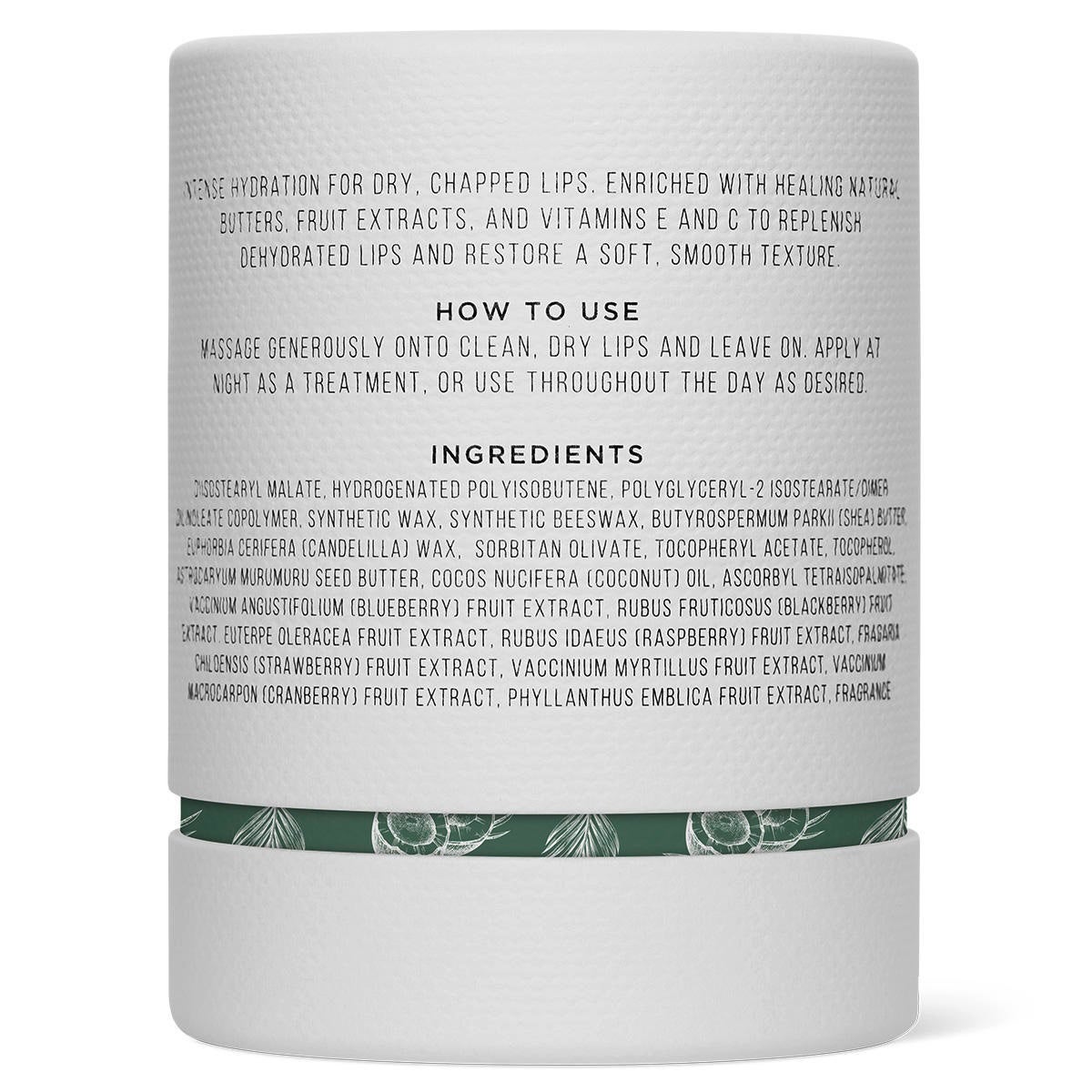 Diisostearyl Malate, Hydrogenated Polyisobutene, Polyglyceryl-2 Isostearate/Dimer Dilinoleate Copolymer, Synthetic Wax, Synthetic Beeswax, Butyrospermum Parkii (Shea) Butter, Euphorbia Cerifera (Candelilla) Wax, Sorbitan Olivate, Phyllanthus Emblica Fruit Extract, Vaccinium Angustifolium (Blueberry) Fruit Extract, Rubus Fruticosus (Blackberry) Fruit Extract, Euterpe Oleracea Fruit Extract, Rubus Idaeus (Raspberry) Fruit Extract, Fragaria Chiloensis (Strawberry) Fruit Extract, Vaccinium Myrtillus Fruit Extract, Vaccinium Macrocarpon (Cranberry) Fruit Extract, Astrocaryum Murumuru Seed Butter, Tocopherol, Cocos Nucifera (Coconut) Oil, Ascorbyl Tetraisopalmitate, Tocopheryl Acetate, Fragrance, Iron Oxide Yellow (CI 77492), Polyglyceryl-2 Triisostearate.