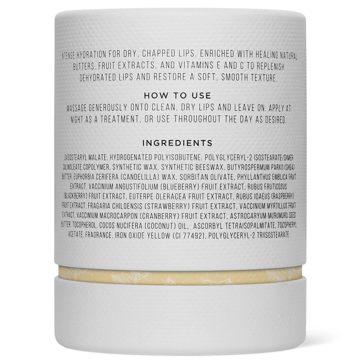 Diisostearyl Malate, Hydrogenated Polyisobutene, Polyglyceryl-2 Isostearate/Dimer Dilinoleate Copolymer, Synthetic Wax, Synthetic Beeswax, Butyrospermum Parkii (Shea) Butter, Euphorbia Cerifera (Candelilla) Wax, Sorbitan Olivate, Phyllanthus Emblica Fruit Extract, Vaccinium Angustifolium (Blueberry) Fruit Extract, Rubus Fruticosus (Blackberry) Fruit Extract, Euterpe Oleracea Fruit Extract, Rubus Idaeus (Raspberry) Fruit Extract, Fragaria Chiloensis (Strawberry) Fruit Extract, Vaccinium Myrtillus Fruit Extract, Vaccinium Macrocarpon (Cranberry) Fruit Extract, Astrocaryum Murumuru Seed Butter, Tocopherol, Cocos Nucifera (Coconut) Oil, Ascorbyl Tetraisopalmitate, Tocopheryl Acetate, Fragrance, Iron Oxide Yellow (CI 77492), Polyglyceryl-2 Triisostearate.