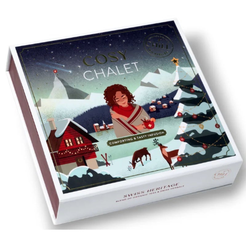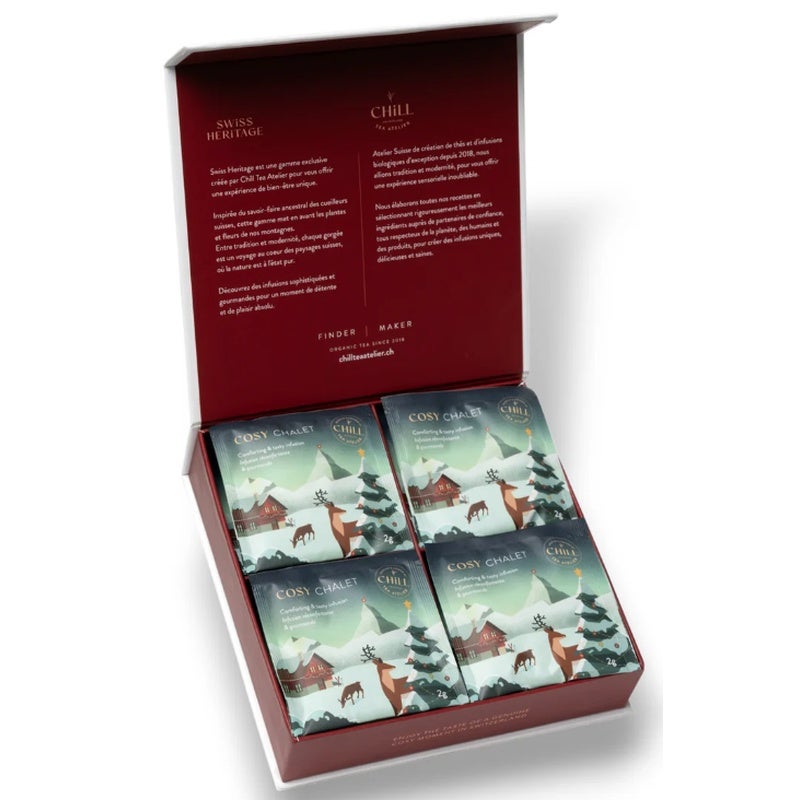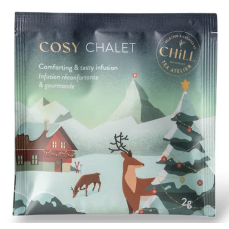 Avec Cosy Chalet, découvrez linfusion bio unique de notre coffret hiver - un hommage aux arômes authentiques des montagnes suisses. Le mélange de pommes, décorces dorange, de cannelle, de clous de girofle, dhibiscus et de plantes alpines, composé avec amour, procure une expérience gustative chaude et bienfaisante et crée une atmosphère confortable et douillette. Chaque gorgée vous transporte dans un chalet suisse et vous rappelle des souvenirs de journées dhiver enneigées dans les montagnes.