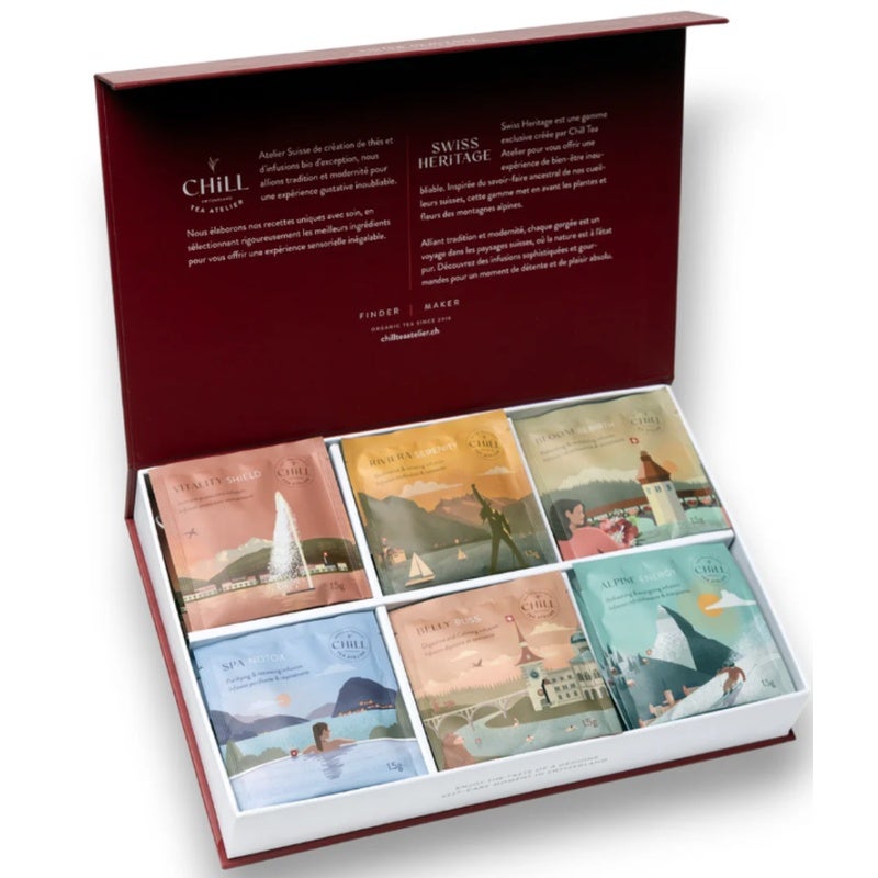 Avec la boîte "Swiss Heritage", découvrez le meilleur de lart du thé suisse dans une collection exclusive. La boîte réunit six infusions soigneusement composées, inspirées par la richesse botanique des Alpes, et vous emmène dans un voyage gustatif à travers les paysages variés de la Suisse. Chaque infusion a été conçue pour refléter larôme, la pureté et le naturel des plantes locales - un plaisir pour tous les sens.