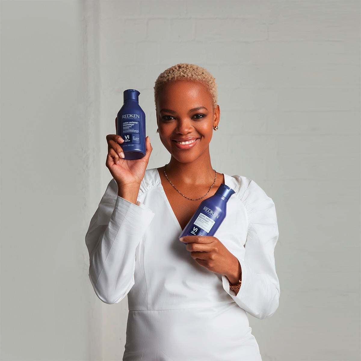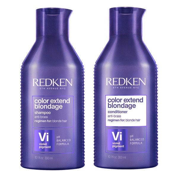 Color Extend Blondage Shampoo : Rehaussez vos cheveux blonds avec le Color Extend Blondage Shampoo. Ce shampooing est le nettoyant doux idéal pour les cheveux blonds et décolorés, et permet de lutter contre les tons jaunes et orange indésirables. Le shampooing anti-jaune protège la couleur et donne aux cheveux une brillance éclatante. Application : Vous devez porter des gants pour appliquer le shampooing. Répartir le produit de soin sur les cheveux humides, faire mousser brièvement puis rincer abondamment. Pour un résultat plus durable : répétez le processus et laissez la mousse agir pendant 3 à 5 minutes. Puis rincez bien. Revitalisant Color Extend Blondage : Le revitalisant Redken Color Extend Blondage protège la couleur et neutralise les tons jaunes et orangés indésirables des cheveux blonds et décolorés. En outre, les cheveux sont renforcés et fortifiés de l'intérieur par le complexe protéique à triple acide. L'après-shampooing pour cheveux blonds colorés et naturels fonctionne mieux en combinaison avec le shampooing Color Extend Blondage. Utilisez également le masque express Redken Color Extend Blondage au besoin pour obtenir une brillance et une douceur parfaites. Application : Appliquez l'après-shampooing sur les cheveux humides après le shampooing. Laissez agir pendant 3 à 5 minutes. Rincez abondamment. Portez des gants appropriés. La mode, l'inspiration, l'innovation - voilà ce qu'est Redken 5th Avenue NYC. Les produits de soins capillaires Redken sont adaptés à différents besoins, garantissant une routine de soins capillaires simple mais optimale - chez le coiffeur et dans votre propre salle de bain. Découvrez le soin parfait pour vos cheveux et faites l'expérience de l'expertise professionnelle de Redken maintenant facilement à la maison.