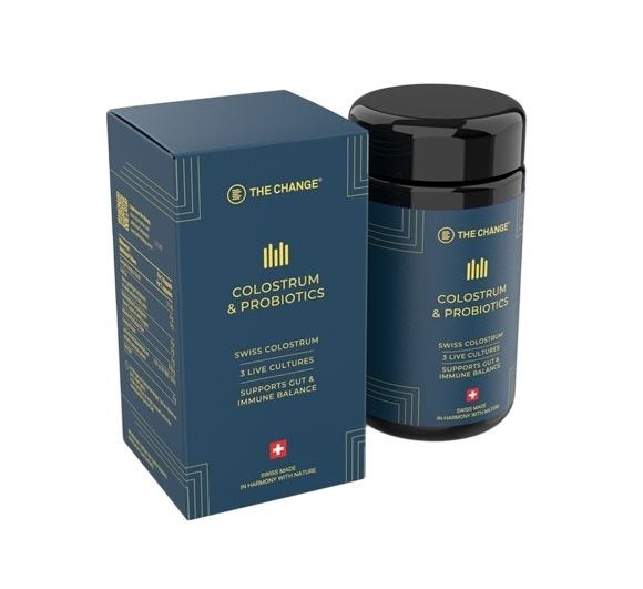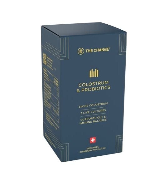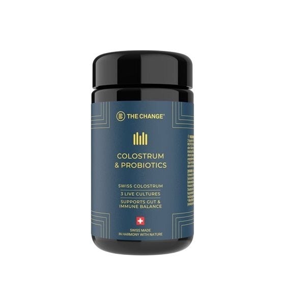 Colostrum de vache suisse dégraissé et décaséinisé (contenant du colostrum), cultures bactériennes probiotiques 10 9 UFC* (Lactobacillus Plantarum, Bifidobacterium Lactis, Streptococcus Thermophilus), matière des capsules (hydromellose, gellane épaississant).