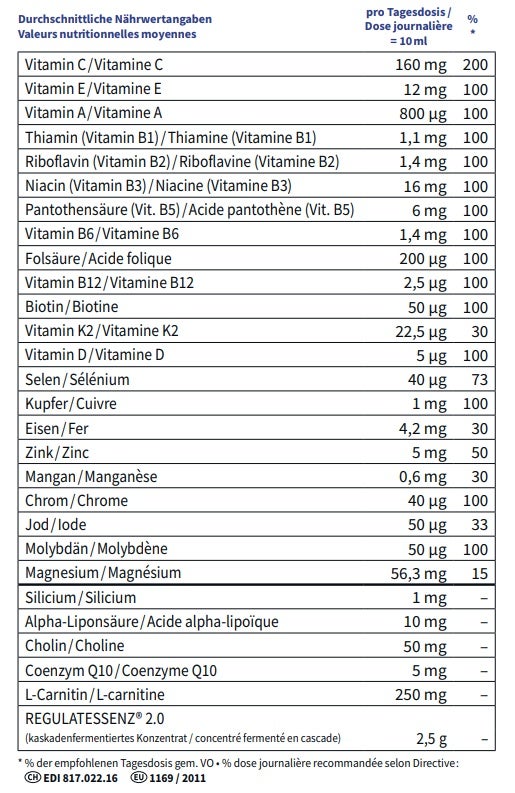 Regulatpro® Complete est un complément alimentaire, qui apporte quotidiennement une large palette de nutriments essentiels 13 vitamines et 10 minéraux pour soutenir votre santé. bien-être et votre joie de vivre. La solution idéale et naturelle un apport complet pour tous les groupes d'âge, de jeunes à vieux ! Mais ce n'est pas tout - nous misons sur la qualité et le lien avec la nature. C'est pourquoi notre essence fermentée Regulatessenz® est également utilisée ici comme taxi de nutriments. Complétée la boisson préventive par 41 plantes soigneusement sélectionnées herbes et 6 super-aliments. Le meilleur dans tout ça ? Avec seulement 10 ml par jour, vous obtenez tout ce dont vous avez besoin pour relever les défis du quotidien. de maîtriser souverainement le quotidien et de vous sentir bien - et tout cela avec un goût frais et fruité.