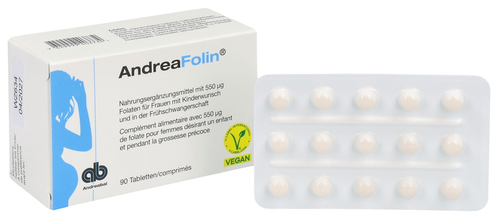 Complément alimentaire avec 550 µg de folate pour femmes désirant un enfant et pendant la grossesse précoce.