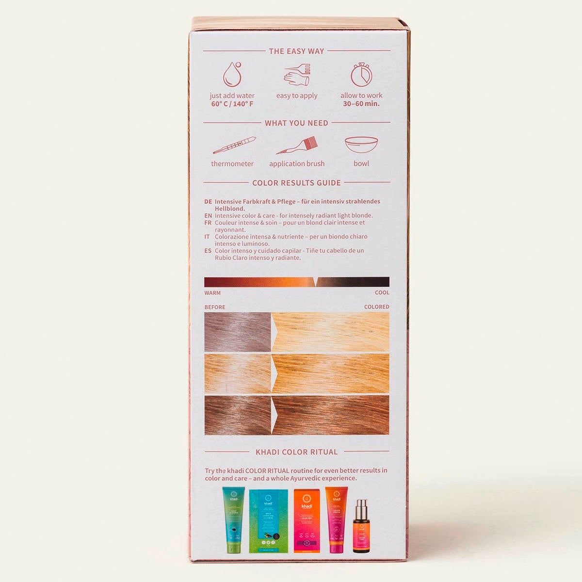 - avec un blond moyen khadi pour un résultat de couleur plus profond et plus intense.