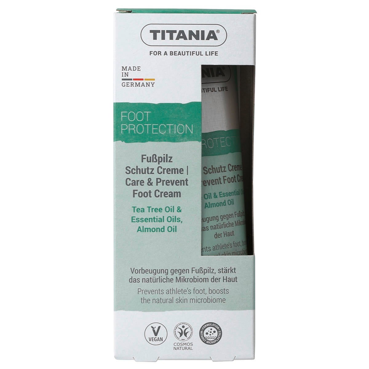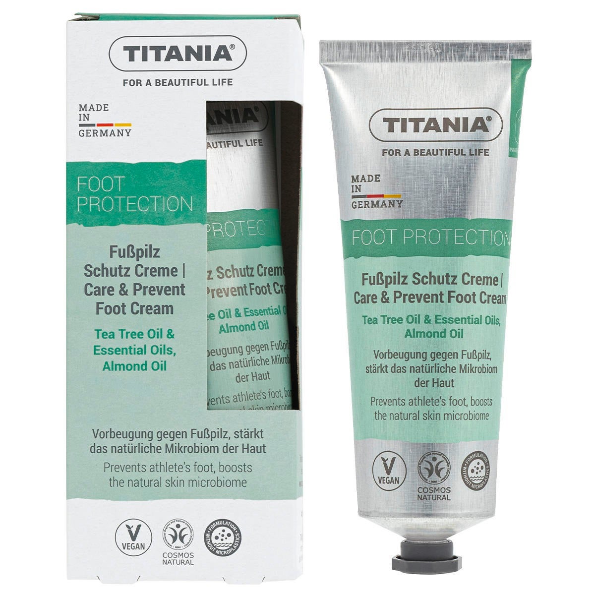 Tea Tree Oil & Essential Oils, huile d'amande. Prévention contre la mycose des pieds, renforce le microbiome naturel de la peau. La crème de protection contre les mycoses des pieds TITANIA® aux huiles essentielles d'arbre à thé, de romarin, de menthe poivrée et d'eucalyptus peut contribuer à la prévention des mycoses des pieds si elle est utilisée régulièrement. Les prébiotiques aident à équilibrer le microbiome de la peau et la rendent plus résistante aux influences environnementales. L'huile d'amande nourrit en outre la peau. Application : appliquer régulièrement et si nécessaire deux fois par jour sur la peau nettoyée et masser légèrement pour faire pénétrer.
