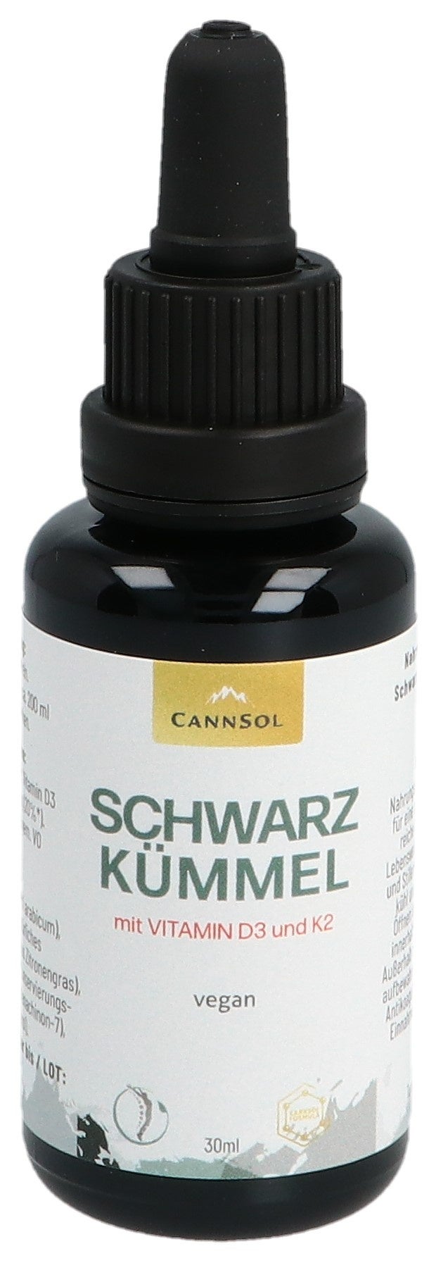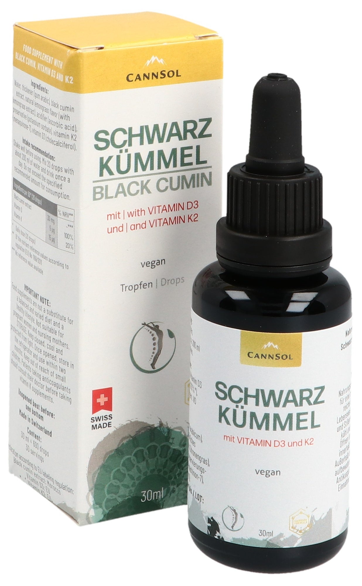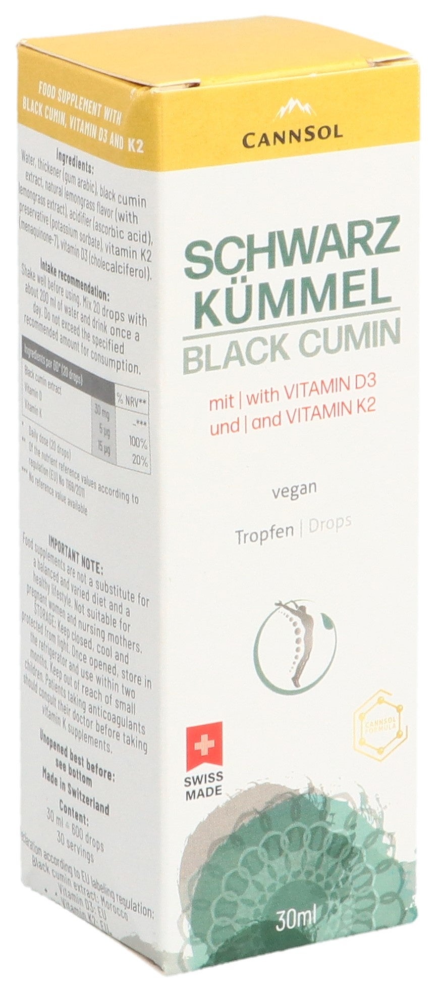 Eau, épaississant (gomme arabique), extrait de cumin noir, arôme naturel de citronnelle (avec extraits de citronnelle), acidifiant (acide ascorbique), conservateur (sorbate de potassium), vitamine K2 (ménaquinone-7), vitamine D3 (cholécalciférol). Ingrédients pour 20 gouttes: Extrait de cumin noir 30mg.