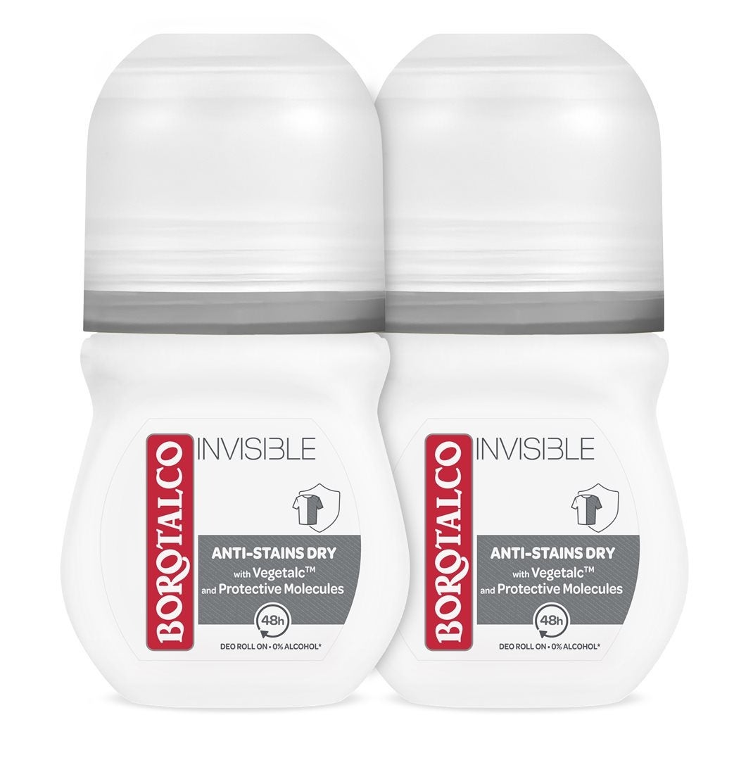 Les produits Borotalco Invisible à 0% dalcool offrent une protection efficace et, grâce à une formule anti-taches spécialement développée, réduisent la décoloration blanche et jaune des vêtements. Le parfum agréable à base de talc aux notes florales et légèrement ambrées est frais et discret.