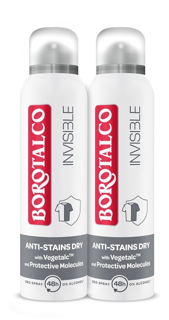 Borotalco Invisible est la ligne de déodorants avec une formule anti-taches spécialement développée pour réduire les bords et les taches sur les vêtements. Réduit les taches blanches et jaunes même sur les tissus délicats comme la soie. Grâce à sa formule Mikrotalk, il absorbe la transpiration et vous fait vous sentir particulièrement sec et frais. Le bâton invisible ne contient PAS de sels daluminium. Le parfum classique dInvisible - composition de parfum floral, légèrement ambré avec une tonalité de base persistante.