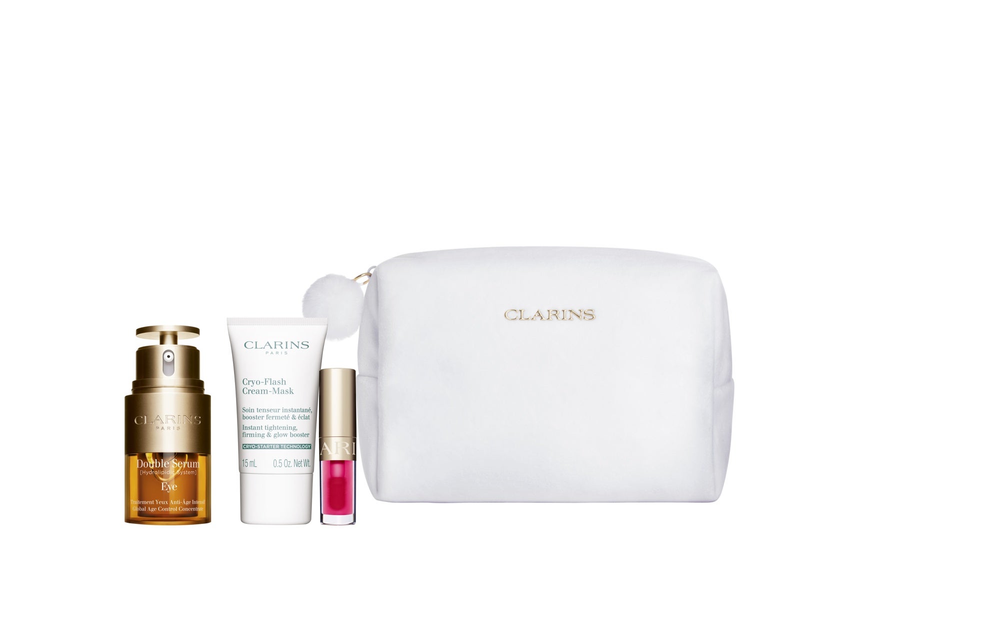 Découvrez le soin regard iconique Clarins en format vente, accompagné d'essentiels beauté ultra-frais pour lisser, défatiguer et sublimer l'éclat du regard et des lèvres.