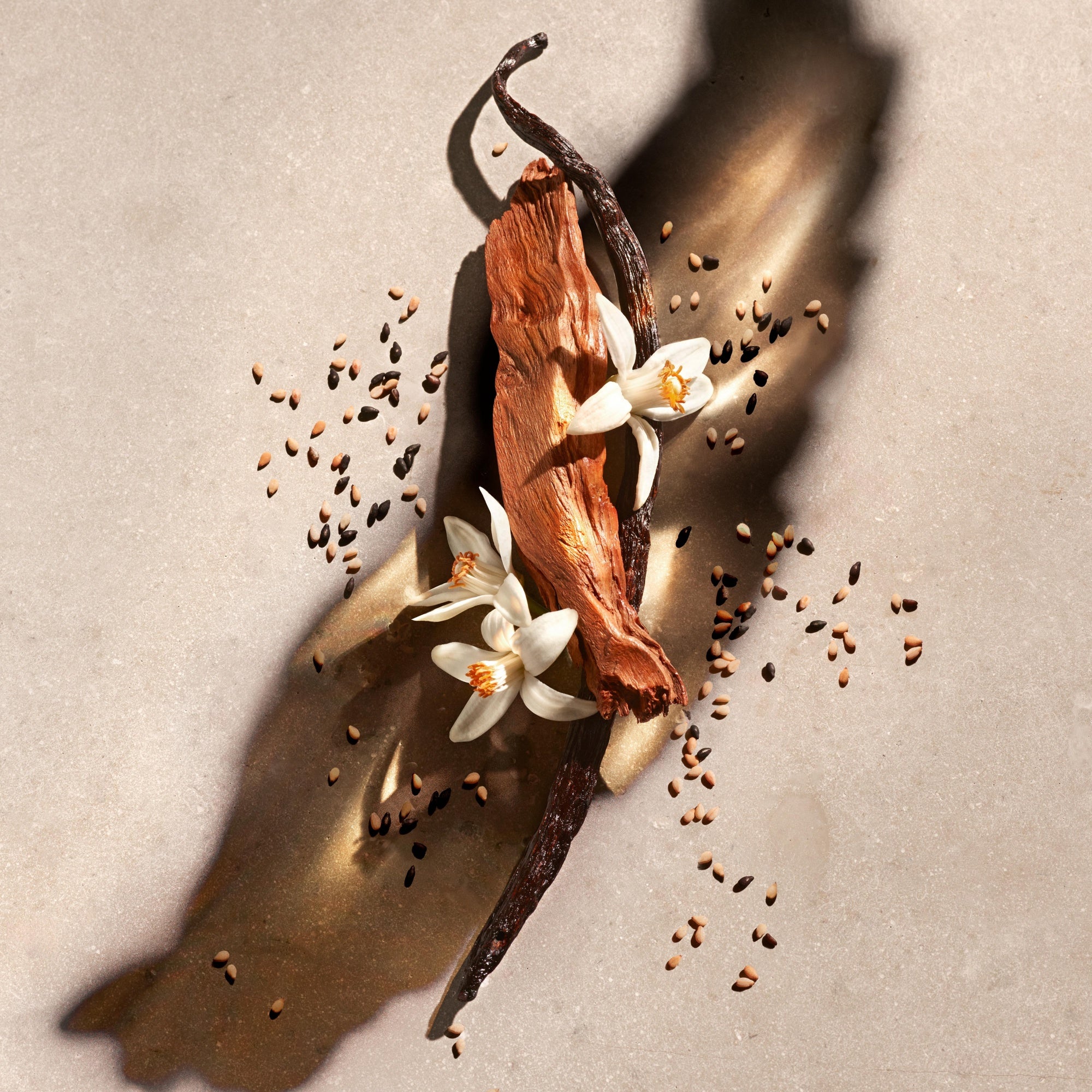 le fond enveloppant mêle des notes sensuelles de vanille torréfiée et un accord de bois de santal crémeux pour un sillage captivant.