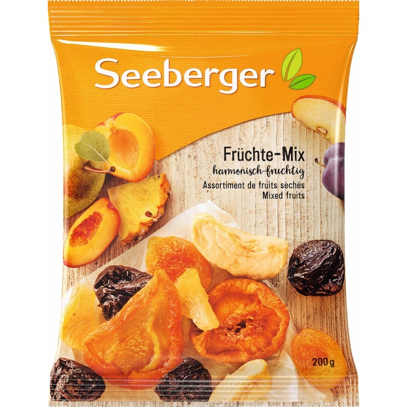 Trockenobst in veränderlichen Gewichtsanteilen (Birnen, Pfirsiche, Aprikosen, Apfelstücke, Ananasstücke), Pflaumen entsteint, Zucker, Säuerungsmittel: Citronensäure, Antioxidationsmittel: NATRIUMMETABISULFIT, SCHWEFELDIOXID, Konservierungsstoff: Kaliumsorbat