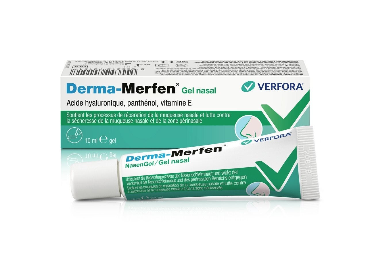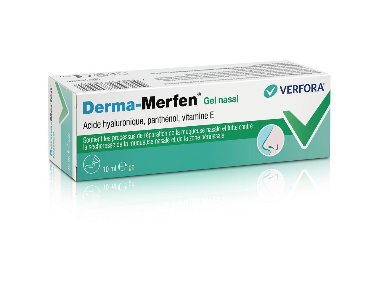 Derma- Merfen NasenGel soutient les processus de réparation de la muqueuse nasale et lutte contre la sécheresse de la muqueuse nasale et de la région périnasale en tge.