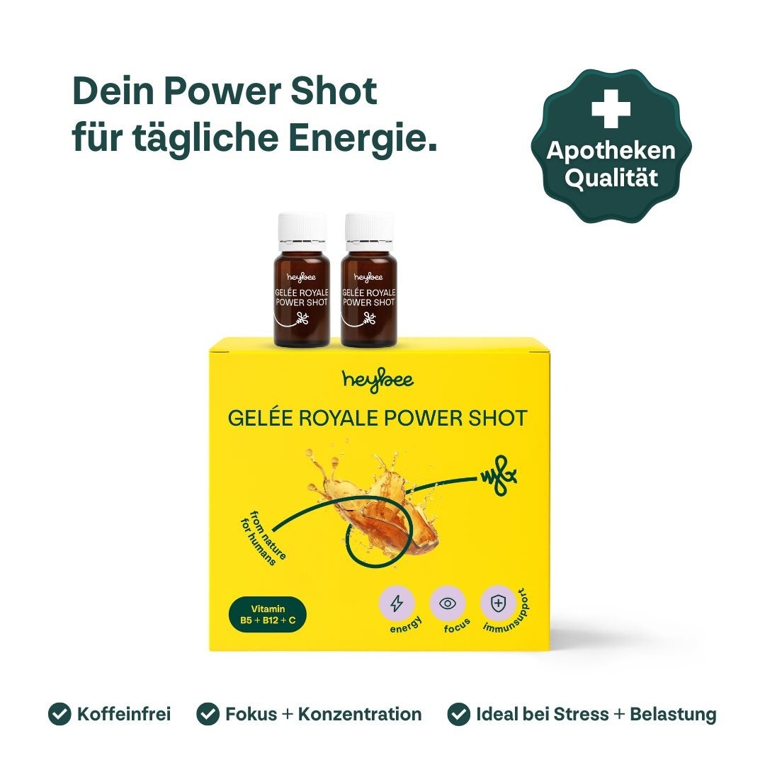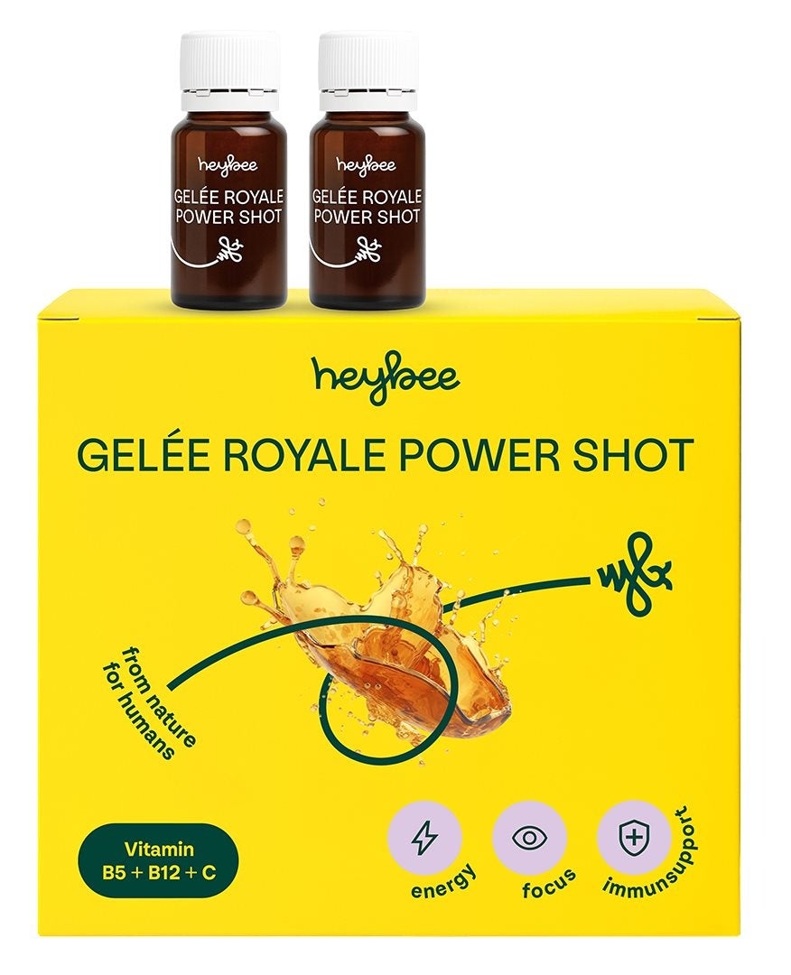 Power Shot naturel sans caféine. Réduit la fatigue et augmente les performances intellectuelles. Une combinaison unique de 600mg de gelée royale, de fruit dacérola, de plante dargousier, de racine dastragale et de vitamines B5 + B12 pour plus dénergie et de concentration.