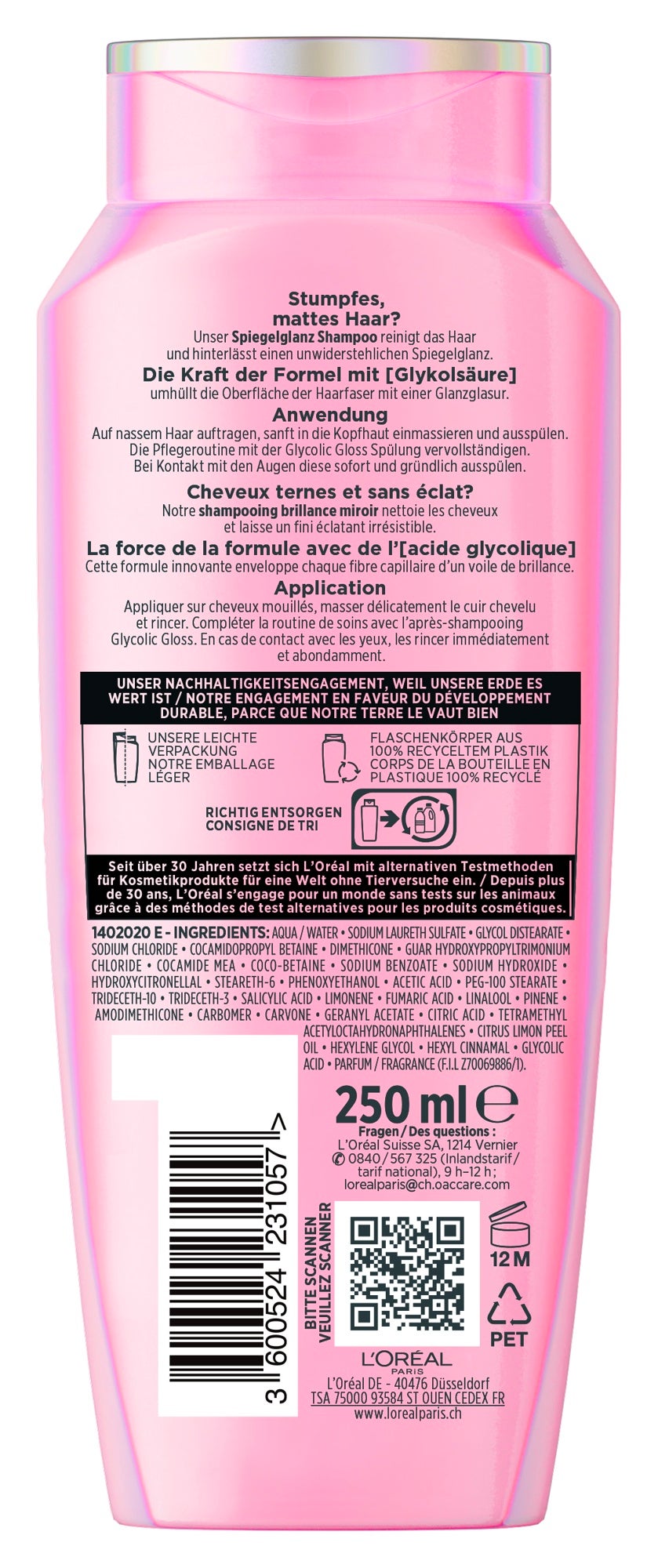 Le shampooing Elseve Glycolic Gloss de L'Oréal Paris fait partie de la gamme de soins capillaires Elseve Glycolic Gloss, qui donne aux cheveux un éclat miroir époustouflant. La formule à base d'acide glycolique prépare non seulement les cheveux à une plénitude maximale, mais lisse également la cuticule. Cela permet à la lumière d'y être réfléchie de manière optimale afin d'augmenter l'éclat du miroir. En même temps, le shampooing nettoie en douceur le cuir chevelu et les cheveux sans les alourdir. Pour apporter un soin supplémentaire aux cheveux, le shampooing fournit aux cheveux jusqu'à 48 heures d'hydratation. En plus du nettoyage et du soin, le shampooing a également un parfum agréable qui commence par le pamplemousse en note de tête et fusionne avec le jasmin en note de cœur. La note de fond séduit par le bois de cèdre.