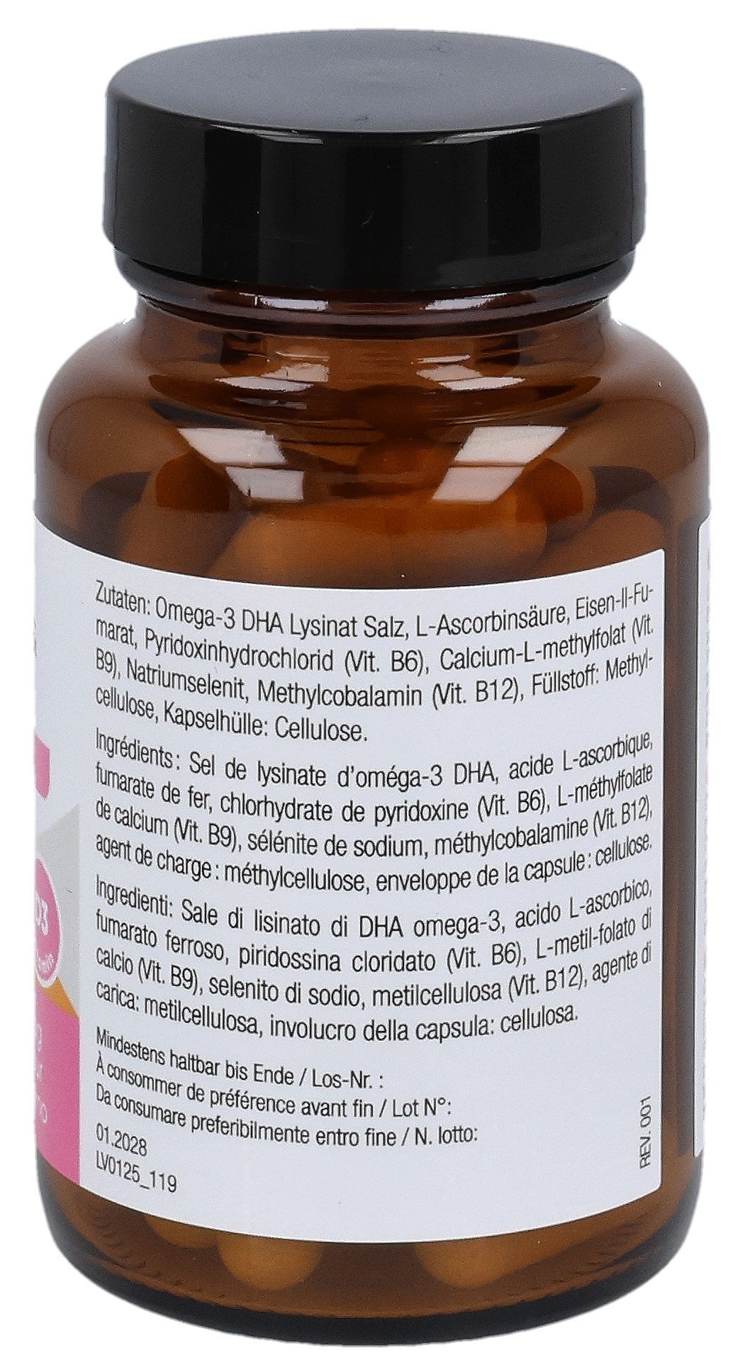 Pour 1 capsule: Sel de lysinate d’oméga-3 DHA (200 mg), acide L-ascorbique (vit. C), fumarate ferreux, chlorhydrate de pyridoxine (vit. B6), L-méthylfolate de calcium (vit. B9) (600 µg, VNR : 300 %), sélénite de sodium, méthylcobalamine (vit. B12), agent de charge : méthylcellulose, enveloppe de la gélule : cellulose.mLysinate d’oméga-3 (algues) : dont : oméga-3 (108 mg), DHA (103 mg), L-lysinate (64 mg).