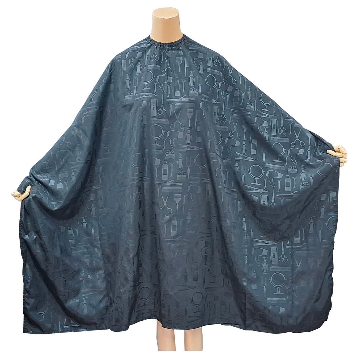 Une cape de coupe de cheveux 100 % imperméable, tissée en polyester, imprimée d'un motif d'outils de coiffure.