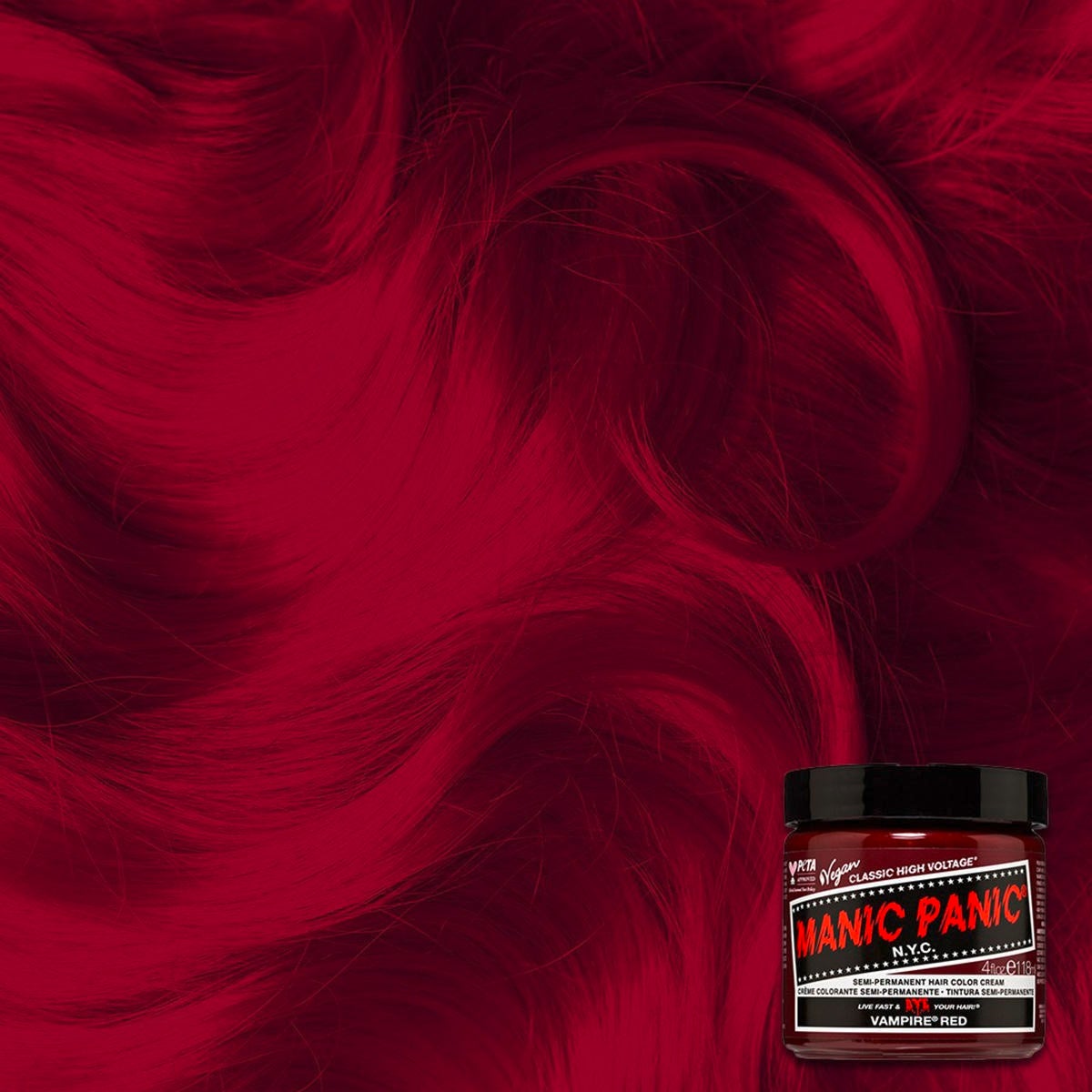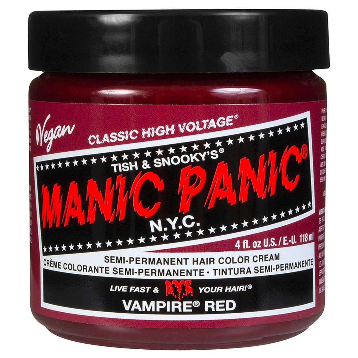 La coloration semi-permanente High Voltage Classic de Manic Panic comprend une multitude de nuances lumineuses. Les ingrédients de qualité utilisés garantissent que tu obtiendras un résultat de coloration de haute qualité. Les ingrédients soignants de la formule conditionnent les cheveux pendant la coloration et assurent ainsi un fini soyeux et brillant ainsi qu'une sensation de douceur. Vampire Red est une coloration rouge sang profonde qui peut donner une teinte bordeaux aux cheveux non colorés et non décolorés. Pour un résultat optimal, nous recommandons d'éclaircir les cheveux au niveau de blond 8 ou plus clair. Caractéristiques importantes :