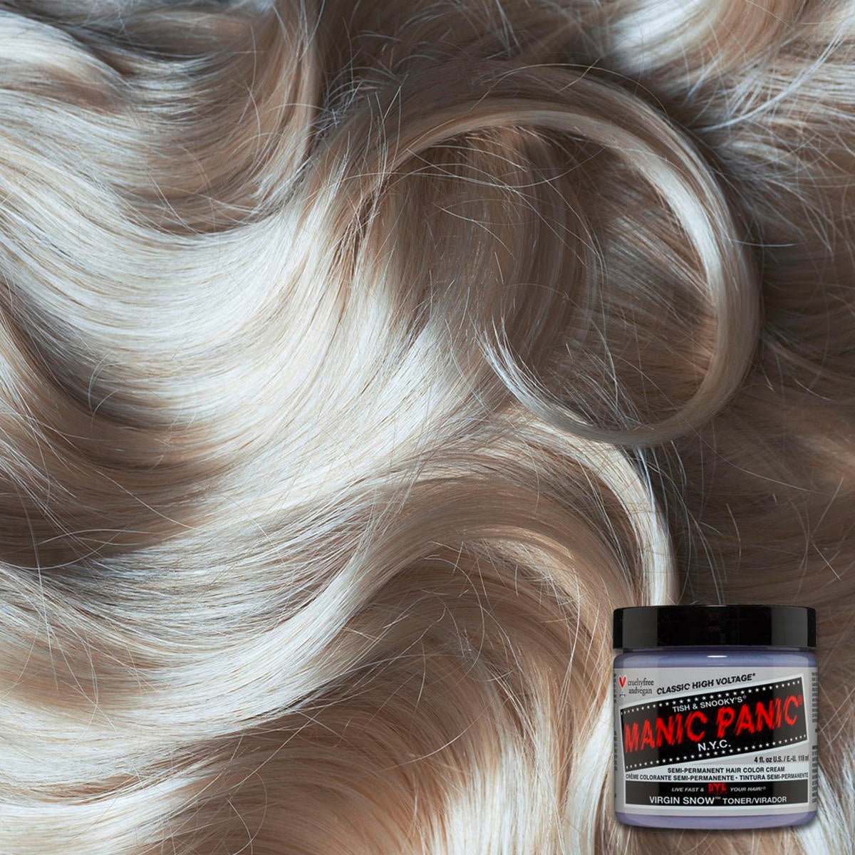 La coloration semi-permanente High Voltage Classic de Manic Panic comprend une multitude de nuances lumineuses. Les ingrédients de qualité utilisés garantissent que tu obtiendras un résultat de coloration de haute qualité. Les ingrédients soignants de la formule conditionnent les cheveux pendant la coloration et garantissent ainsi un fini soyeux et brillant ainsi qu'une sensation de douceur. Virgin Snow est une coloration bleue qui contribue à éliminer les reflets laiton sur les cheveux blonds de niveau 10 ou plus. Les nuances pastel & grises contiennent moins de pigments que les nuances vives de Manic Panic et s'estompent donc plus rapidement. Utilise Virgin Snow pour créer une teinte froide comme base avant de teindre avec des couleurs Manic Panic plus claires ou simplement pour rafraîchir ton blond. Caractéristiques importantes :