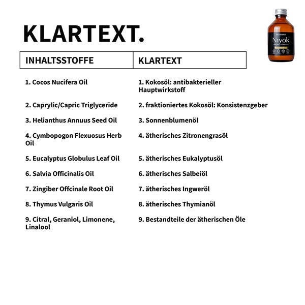 L'huile buccale naturelle à base d'huile de coco de Niyok protège les dents, les gencives et surtout les espaces interdentaires. L'huile de noix de coco biologique hautement concentrée prévient les inflammations et a un effet antibactérien. La combinaison unique de 4 huiles efficaces crée un équilibre bactérien sain dans la cavité buccale. Conditionné dans une bouteille en verre sans plastique. Le bain de bouche a un goût de citronnelle rafraîchissante et de gingembre revigorant (sans menthe). Application : Faites circuler l'huile dans les espaces interdentaires pendant cinq à dix minutes le soir ou le matin et jetez-la dans un chiffon à la fin. Agiter avant l'utilisation. Niyok est synonyme de cosmétiques naturels végétaliens dans un style minimaliste. Pas de microplastiques. Sans huile de palme. Fabriqué en Allemagne.