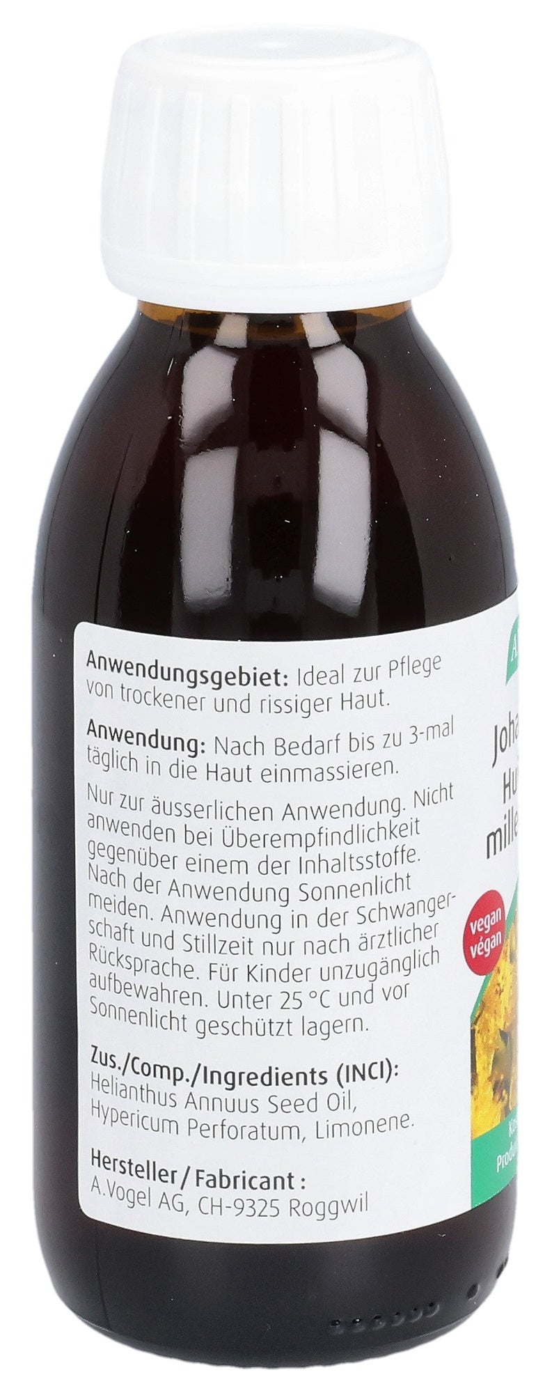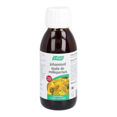Huile de soin de fleurs de millepertuis (herbe de la St-Jean) fraîchement récoltées et issues de l'agriculture biologique contrôlée.