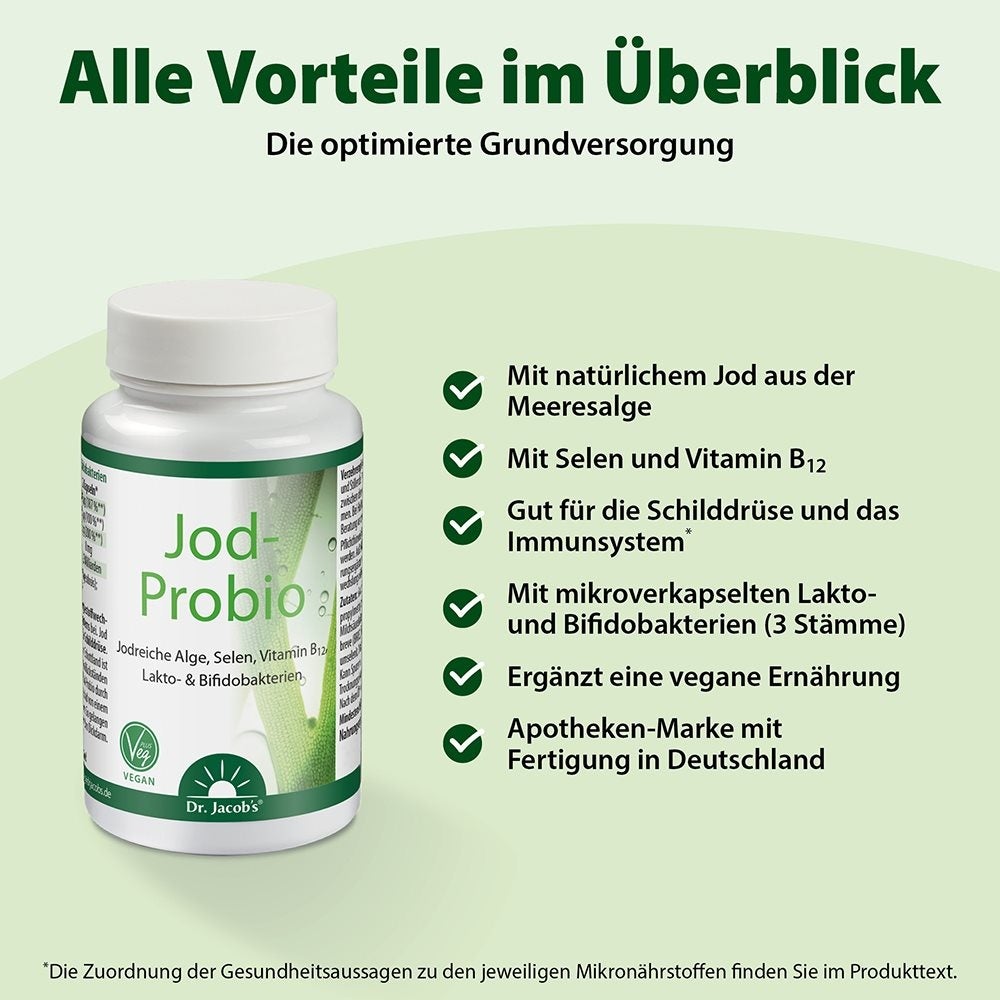 Iode-Pr obio combine de précieux nutriments avec des cultures pr obiotiques et soutient ainsi de manière naturelle le système immunitaire, le métabolisme énergétique et la fonction thyroïdienne. Les lact obazilles et les bifid obbactéries microencapsulées favorisent une flore intestinale saine - là où se trouve la majeure partie du système immunitaire. Parallèlement, le sélénium et Vitamin B12 contribuent au fonctionnement normal du système immunitaire, tandis que liode soutient en outre la thyroïde et les performances cognitives. Idéal pour les régimes végétaliens ou végétariens.