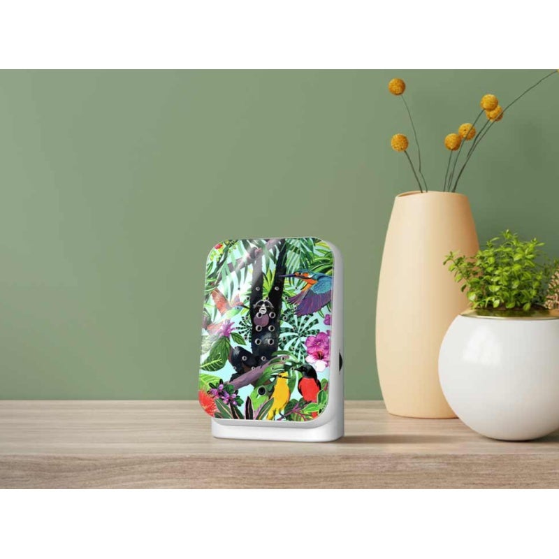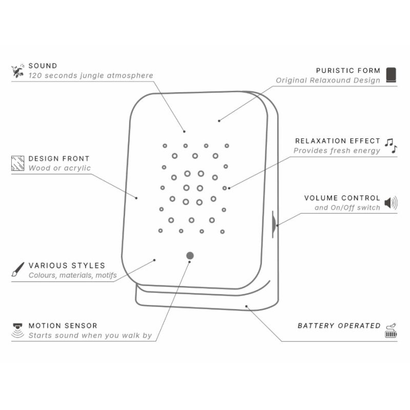 Tu actives lambiance sonore de la Junglebox en passant par le capteur de mouvements. Le volume est réglable en continu. Grâce à sa taille compacte et à son fonctionnement pratique sur batterie, tu peux profiter partout de la force rafraîchissante de la jungle. Dans la salle de bain, sur ton bureau, sur le balcon ou la terrasse : désormais, ta jungle préférée sera toujours à portée de main.
