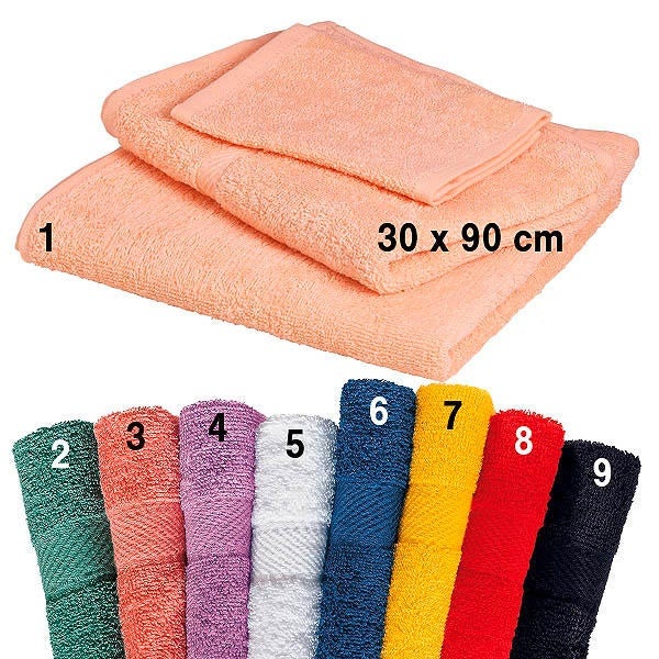 30 x 90 cm, 100 % coton, couleur grand teint, particulièrement résistantes, d'une bonne qualité semi-épaisseur, finition liteau soignée. Poids 360 grs/m2. L'alternative ­économique et propre à ­l'environnement spéciale pour le Salon. Gain de place, une consommation de moins de 40 % d'énergie au lavage et en produits de rinçage.