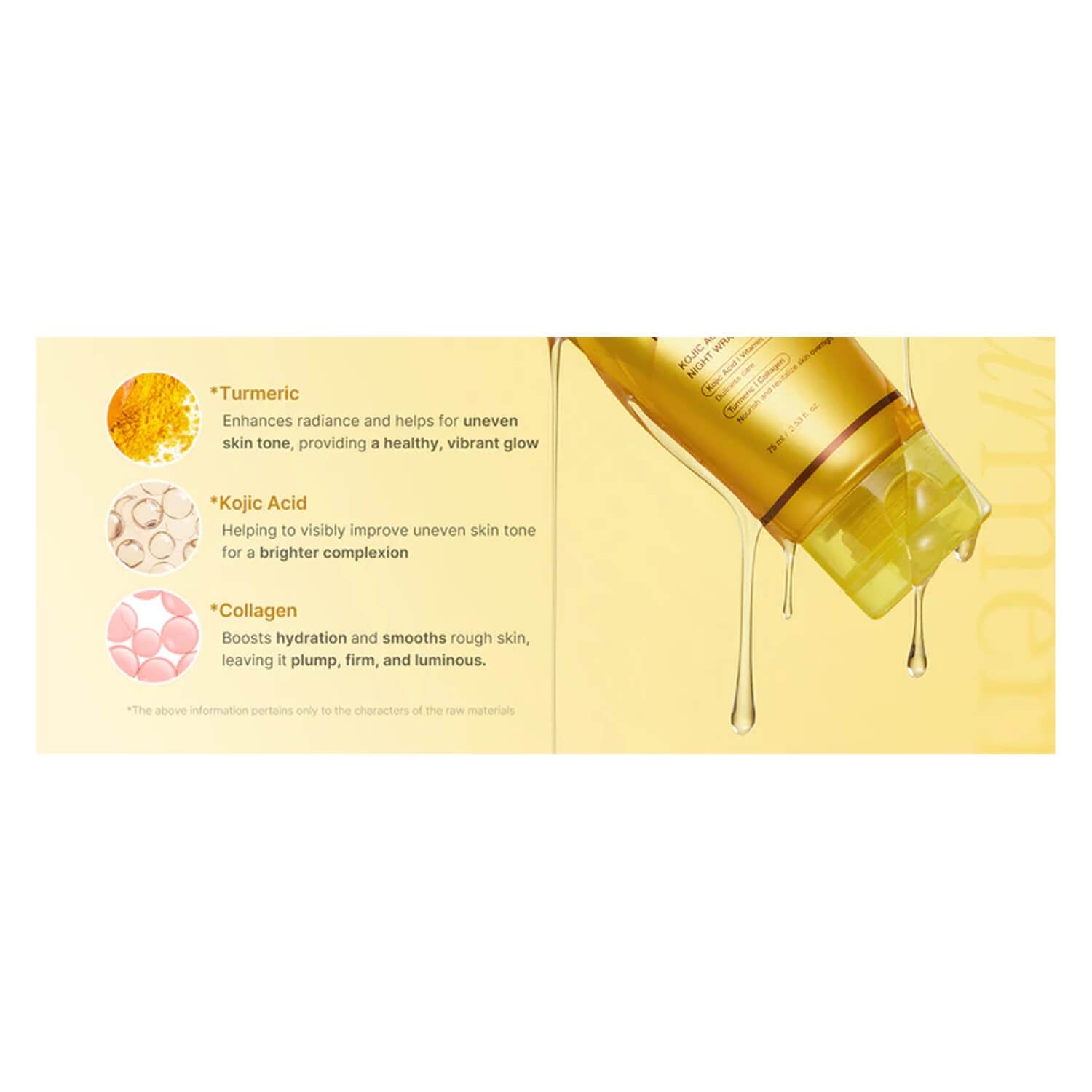 Le masque de nuit enveloppant à l'acide kojique et au curcuma est un soin intensif de nuit qui illumine, hydrate et lisse la peau pendant le sommeil. Grâce à l'acide kojique, au curcuma, au rétinol et au collagène, il assure un teint uniforme, plus d'élasticité et une hydratation en profondeur pendant la nuit.