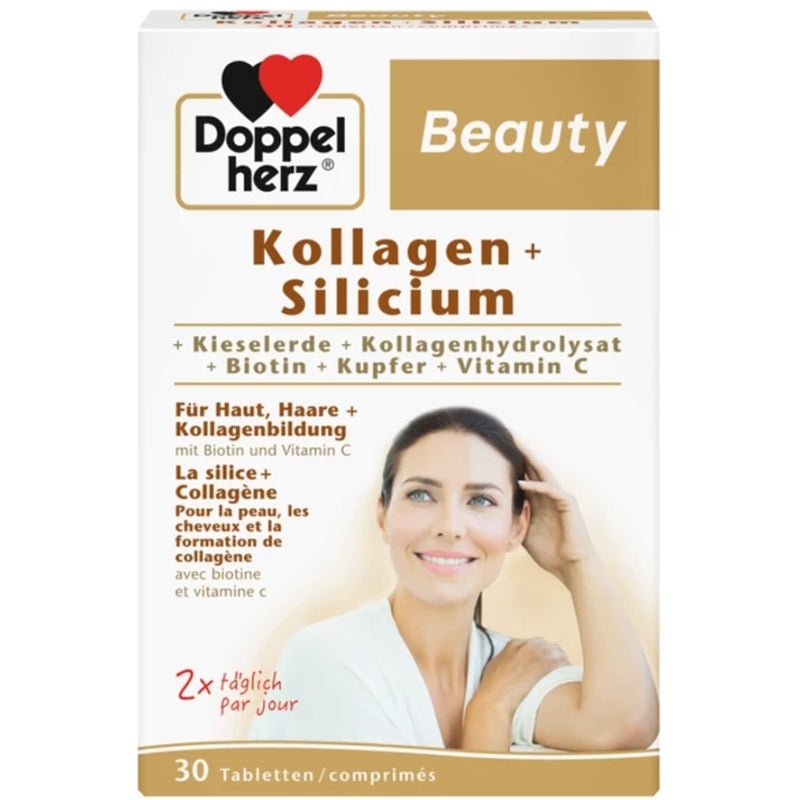 Kieselerde 33%, Füllstoffe: Sorbit, Cellulose, Polyvinylpyrrolidon Trennmittel: Silicium dioxid, Magnesium hydroxid carbonat, Talkum L-Ascorbinsäure, Kollagenhydrolysat 2%, Überzugsmittel: Hydroxypropylmethylcellulose Hydroxypropylcellulose, Polyethylenglycol Stärke, Emulgator: Palmfett (ganz gehärtet), Mono- und Diglyceride von Speisefettsäuren Farbstoffe: Calcium carbonat, Eisenoxide und -hydroxide Calcium-D-pantothenat, Zinkoxid, Mangansulfat, Kupfersulfat, Pyridoxinhydrochlorid, Riboflavin, D-Biotin, Pteroylmonoglutaminsäure, Natriumselenit, Natriummolybdat.