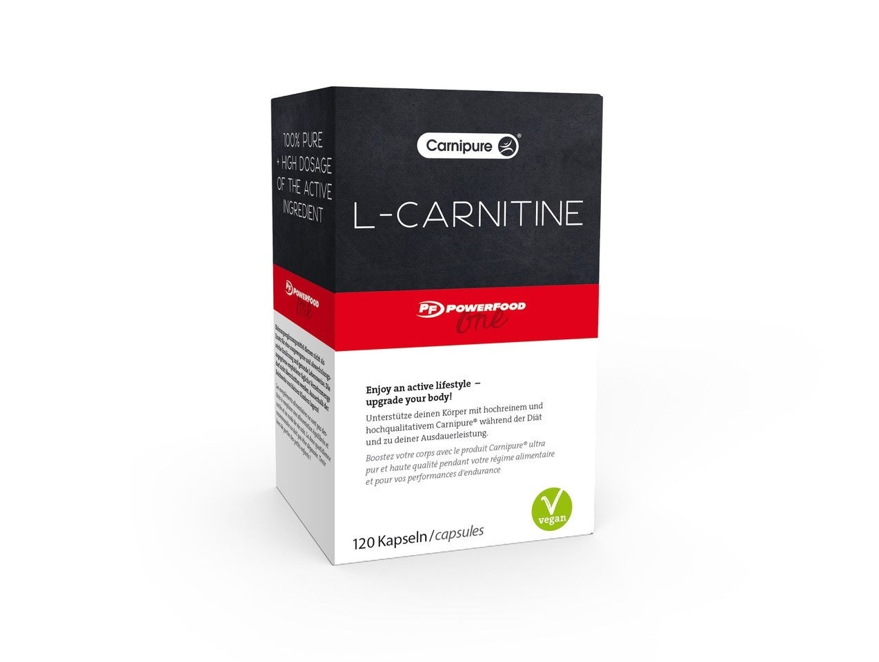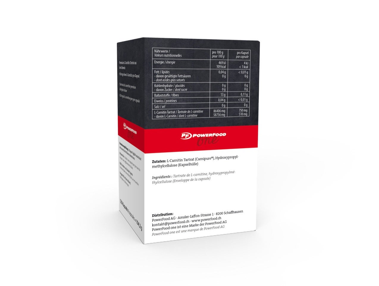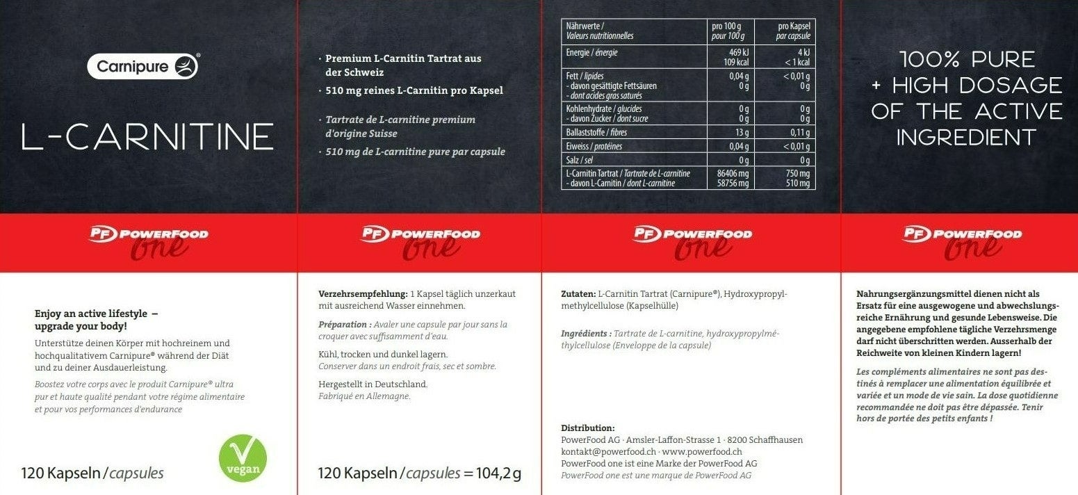 PowerFood One L-Carnitine Carnipure® contient du Carnipure® fabriquée en Suisse. La meilleure qualité de L-Carnitine.