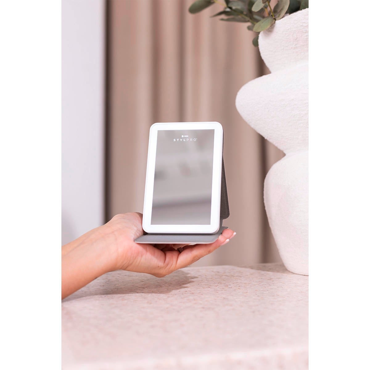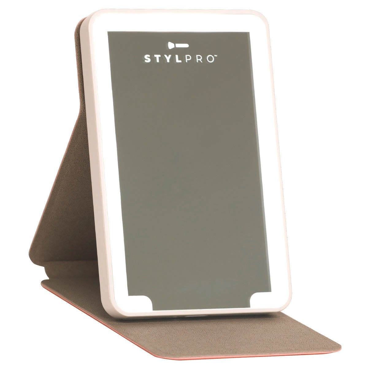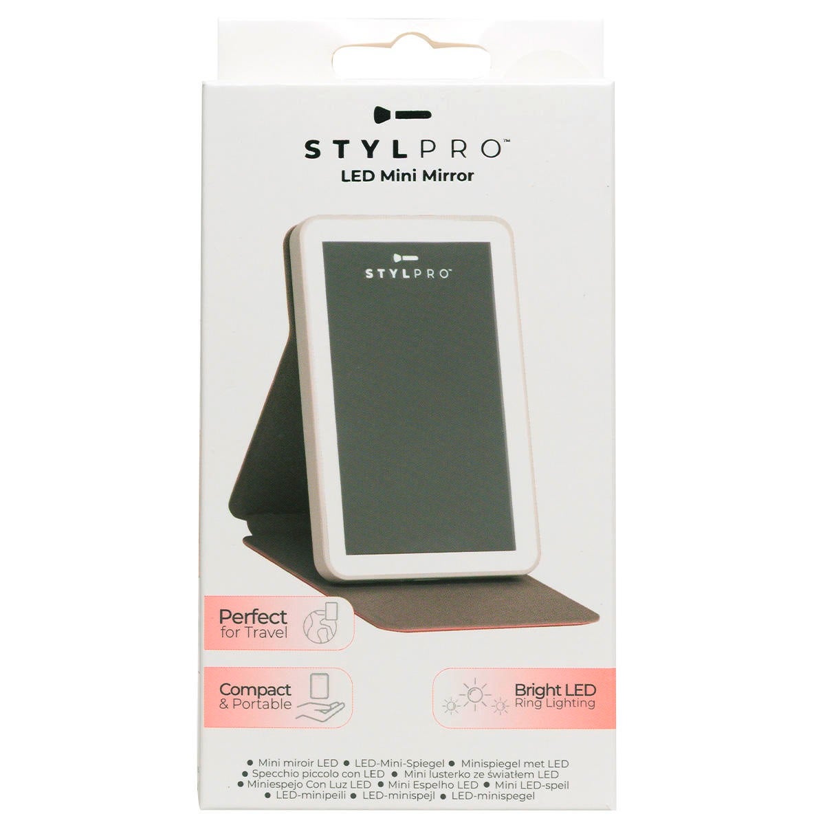 STYLPRO LED Mini Mirror est un mini-miroir léger, fin et portable, doté de panneaux lumineux LED, parfait pour les retouches en déplacement.