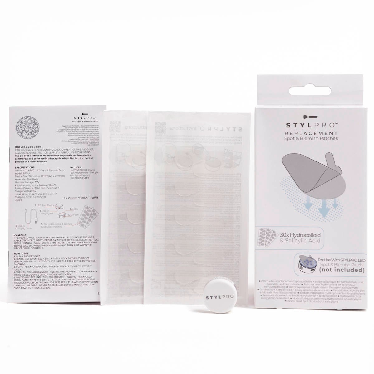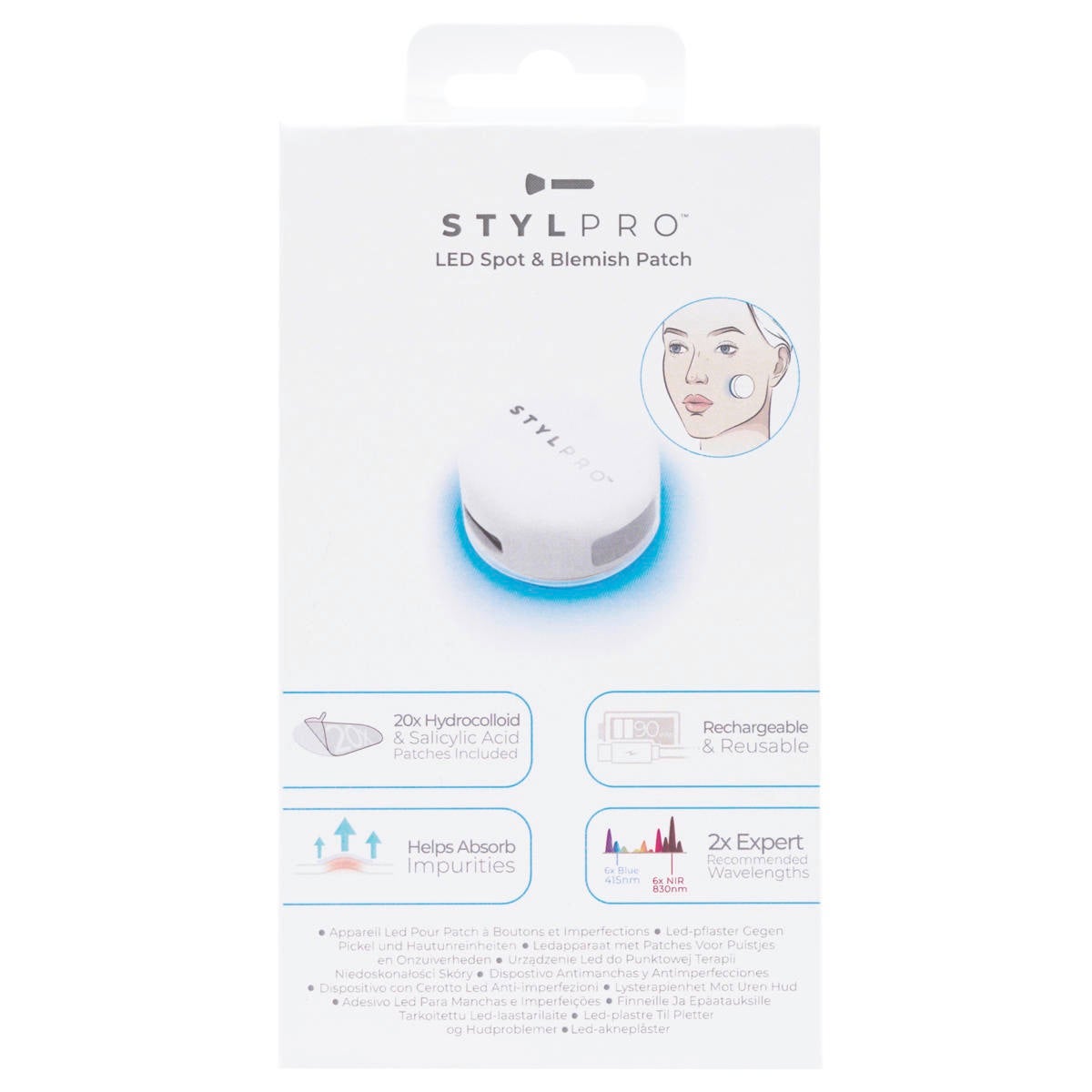 STYLPRO™ LED Spot & Blemish Patch est une solution de soin de la peau rechargeable qui combine la lumière bleue avec des patchs d'hydrocolloïde et d'acide salicylique pour une utilisation ciblée dans votre routine de soin cosmétique de la peau. Objectifs . Rafraîchir la peau. Transformer la peau. Obtenez une peau plus claire et plus lisse avec le STYLPRO LED Spot & Blemish Patch rechargeable et 20 STYLPRO patchs en stick hydrocolloïde et acide salicylique. L'appareil LED dispose de 6 LED bleues (415 nm) et de 6 LED proches de l'infrarouge (830 nm). Les stick-patchs aident à absorber les impuretés (sébum, saleté), à exfolier en douceur et à protéger la peau de l'exfoliation. Convient également aux peaux sujettes aux impuretés.