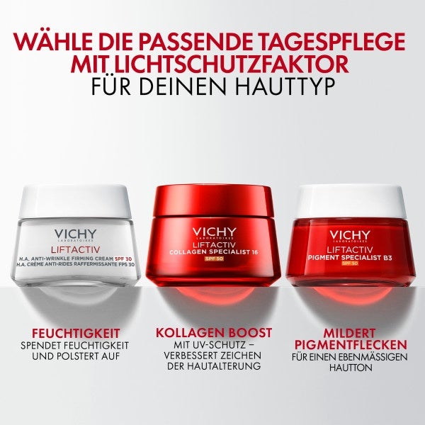 La crème LIFTACTIV Collagen Specialist 16 SPF 50 de Vichy est un soin anti-âge qui, grâce à la technologie C16 Co-Bonding, corrige 16 signes de vieillissement cutané. Elle améliore les rides et les ridules, la fermeté, le rebond, le relâchement, le grain de peau, la tonicité, la densité, la force, l'apparence des pores, l'éclat, la douceur, la souplesse, les contours, le l'hydratation, l'uniformité. Offrant également une protection UV efficace, sa formule à absorption rapide hydrate intensément sans coller, grâce à un complexe d'actifs à base de Rhamnose, de peptides de collagène et de Maitake.